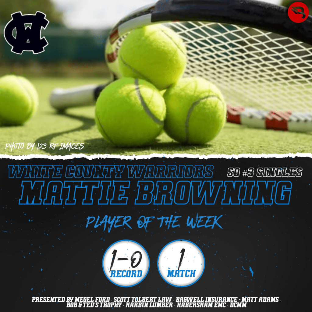 Mattie Browning went 1-0 for the White County Lady Warriors last week, as the sophomore played at 3-singles. She earns her first career POW award.