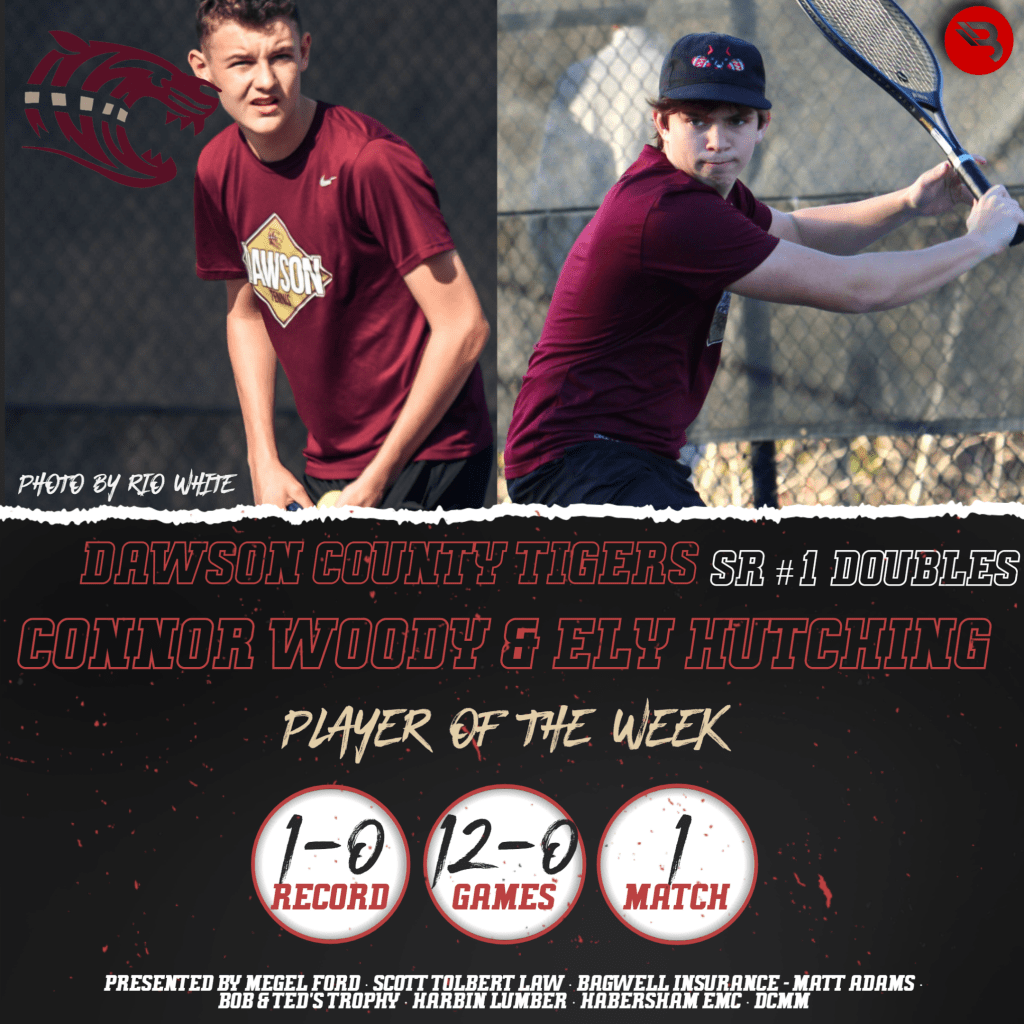 The BLITZ Boys Tennis Players of the Week are Rusty Spencer (Stephens County) and Dawson County’s Connor Woody & Ely Hutching. Spencer won the Fan Vote with 6,001 of the 11,287 total votes. The Dawson doubles combo was the BLITZ Pick.