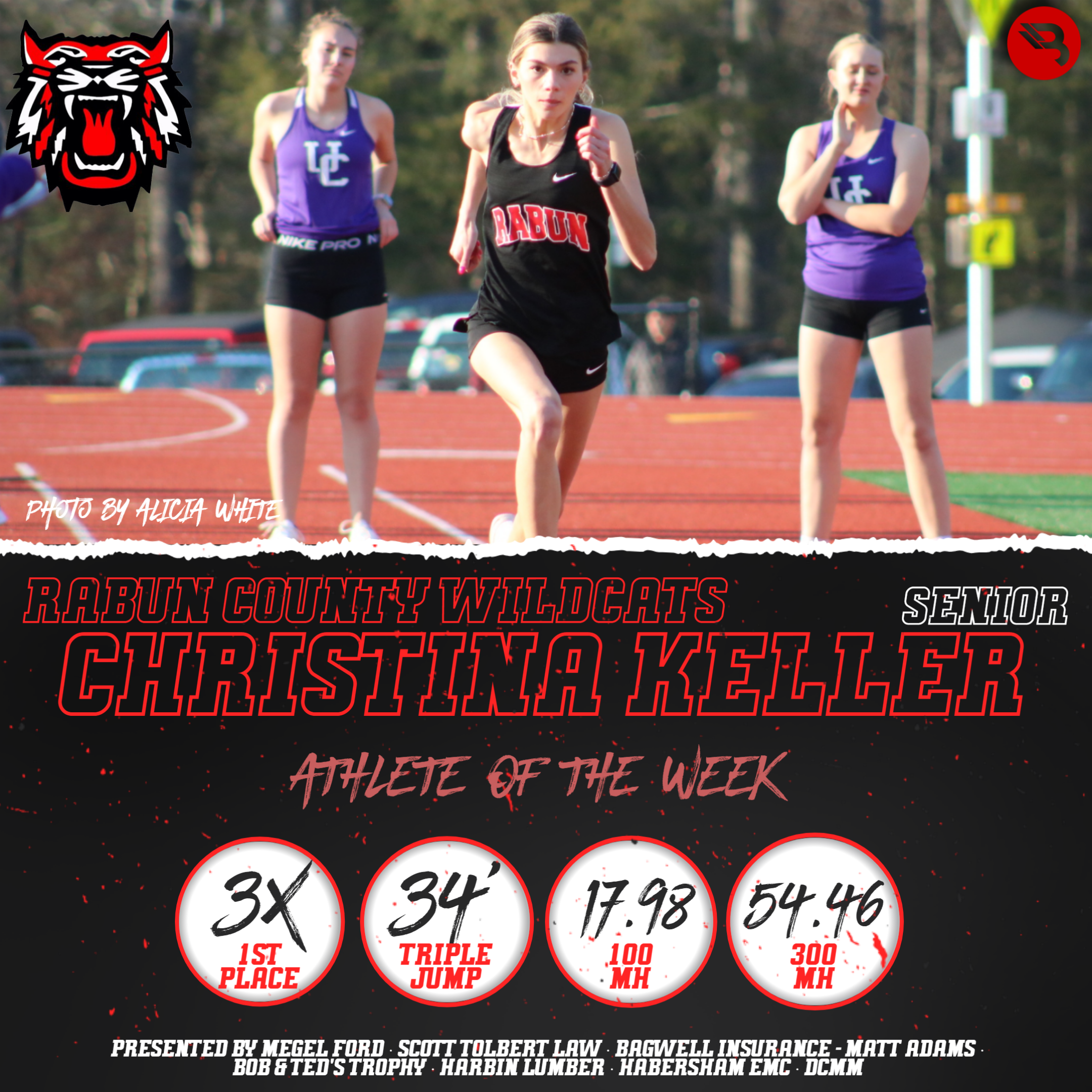 What a phenomenal outing for Rabun County’s Christina Keller. The senior, in a meet against Union County, placed first in 4 events – the triple jump, 100 MH, and 300 MH, as well as anchoring the 4×400 relay. In the triple jump, Keller registered a jump of 34′. In the 100 MH, her 17.98 place her first, and same with her 54.46 time in the 300 MH. Keller’s triple jump is the most remarkable, as she is currently Top-25 among all classifications and first in Class 1A DI with that distance. This is Keller’s first POW award.