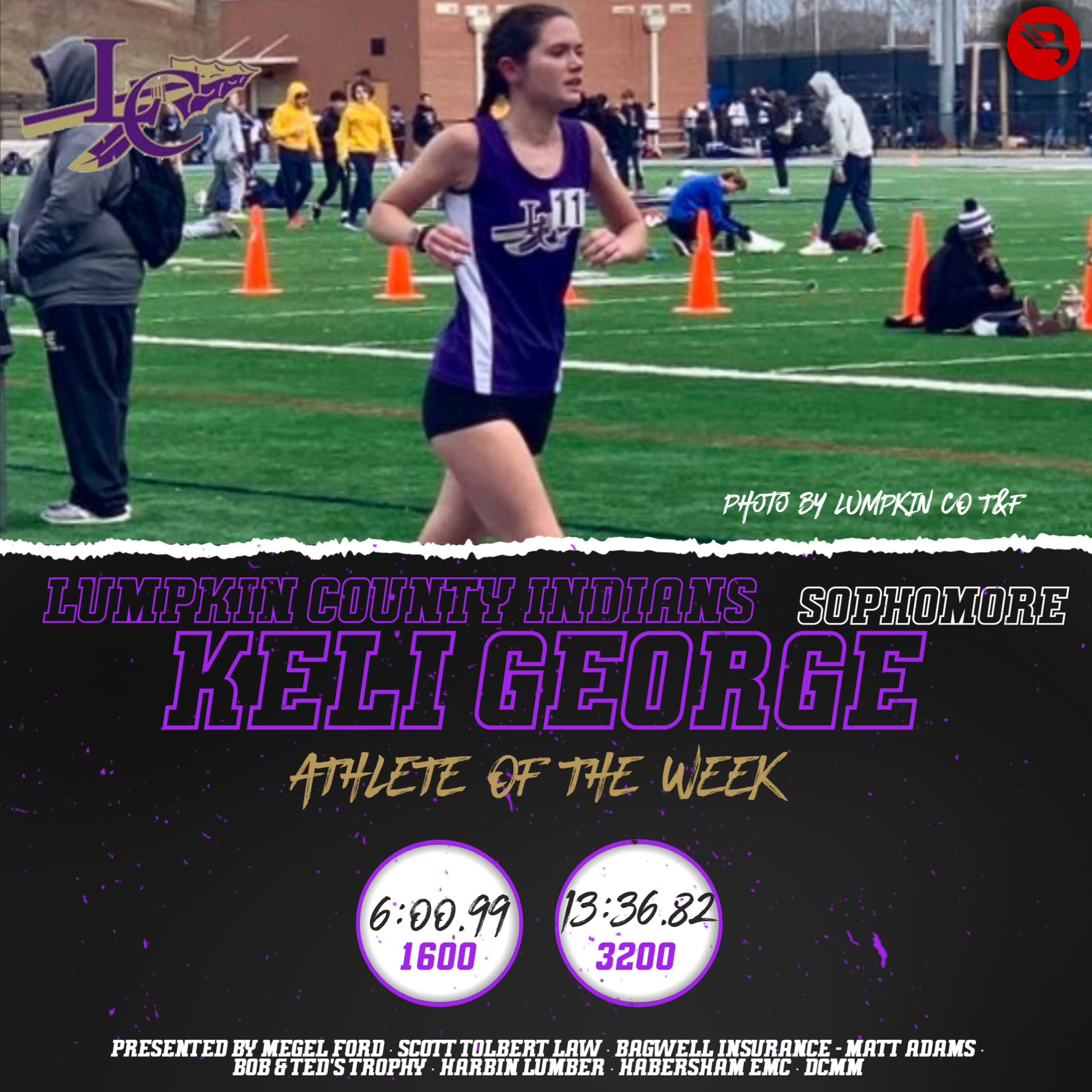 At the 11th Annual Marietta Distance Carnival, Lumpkin County sophomore Keli George finished 47th in her 1600 run at 6:00.99. She was 21st in the 3200 with a 13:36.82. This is her third career POW award.