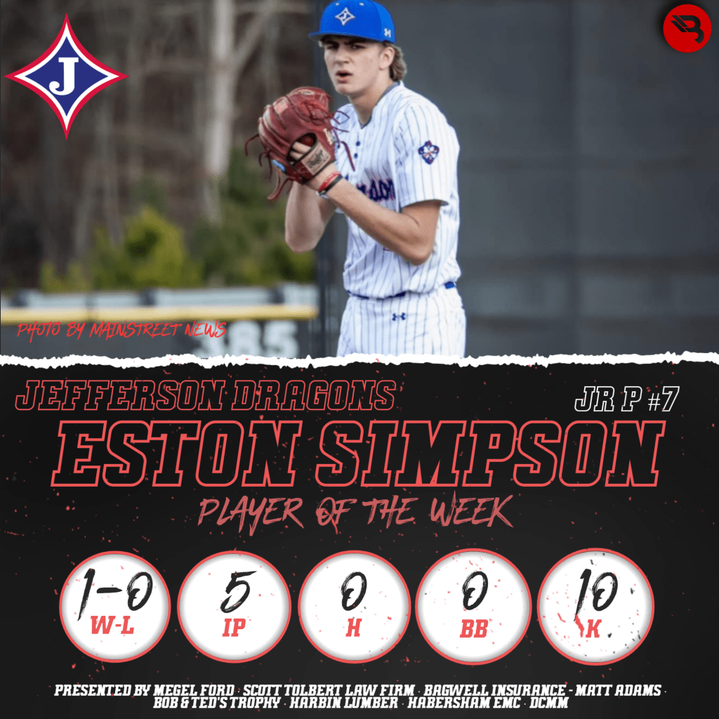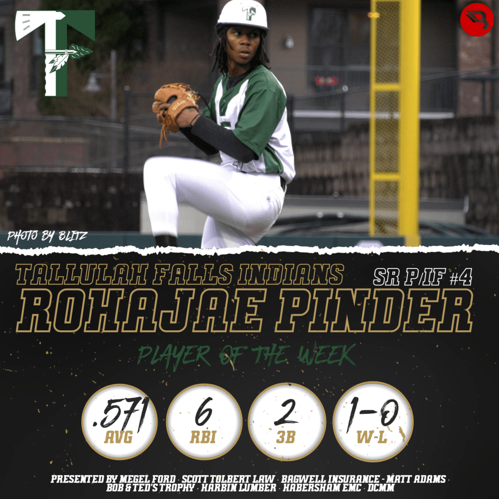 The BLITZ Baseball Players of the Week are Rohajae Pinder (Tallulah Falls) and Eston Simpson (Jefferson). Pinder won the Fan Vote after taking 16,365 of the 31,188 total votes. Simpson was the BLITZ Pick.