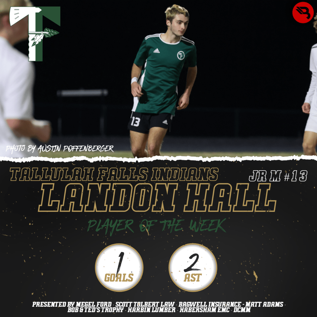 Landon Hall had a goal and 2 assists last week for the #2-ranked Tallulah Falls Indians. This is the junior midfielder’s second POW award of his career. For the season, Hall has 4 goals and a team-high 7 assists.