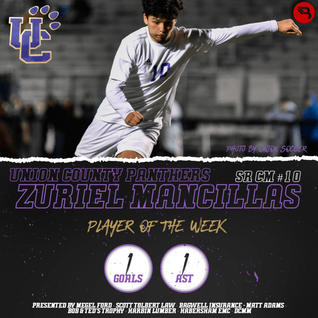 Zuriel Mancillas had a phenomenal game for the #2-ranked Panthers. Last week, Union County was down 2-0 against #10 Providence Christian with less than 13 minutes on the clock. Mancillas and Union scored 2 goals to force overtime in the rain, then won the game 3-2. Mancillas had a goal and an assist. The senior center mid earns his second career POW award.