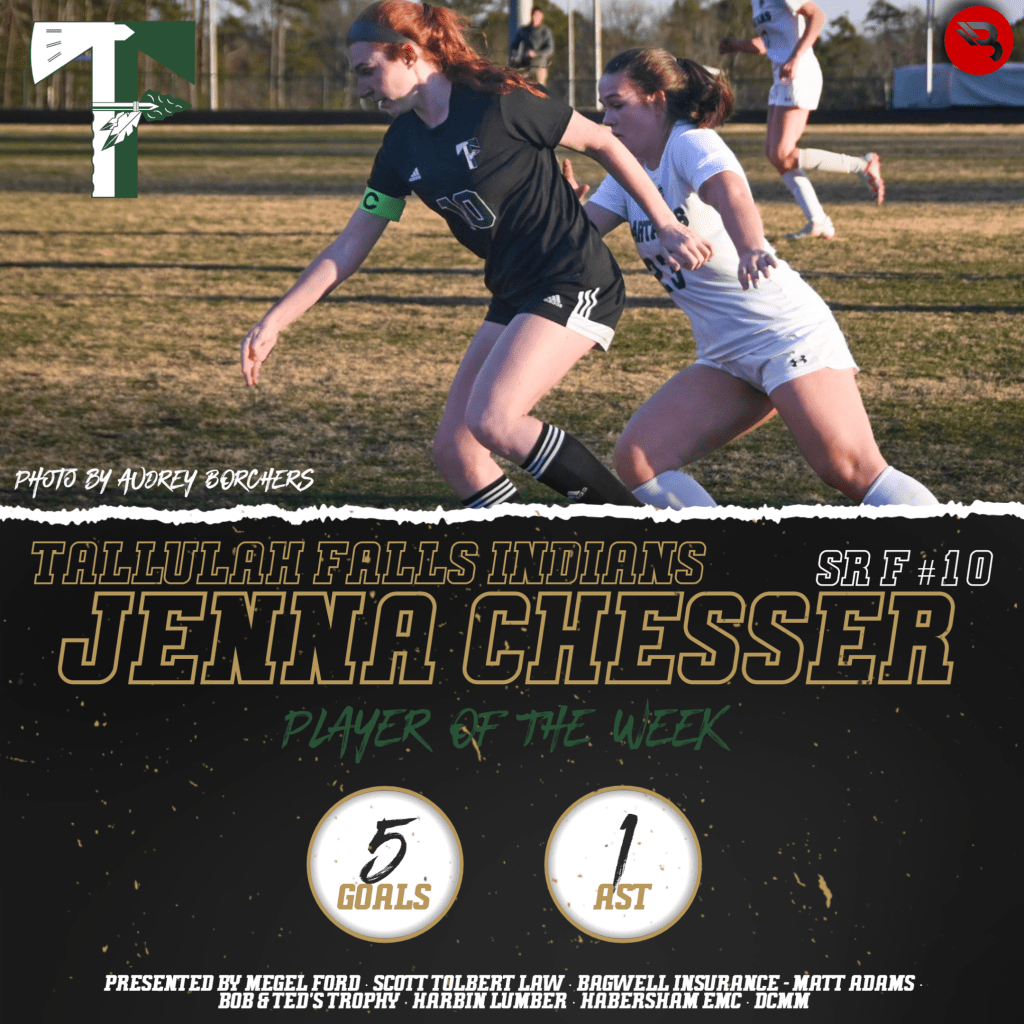 Senior Jenna Chesser is having a breakout season offensively. The forward punched in 5 goals last week for the #7-ranked Lady Indians, and had an assist. One game featured a hat trick. For the season, Chesser now has 13 goals with 3 hat tricks. This is her third career POW award.