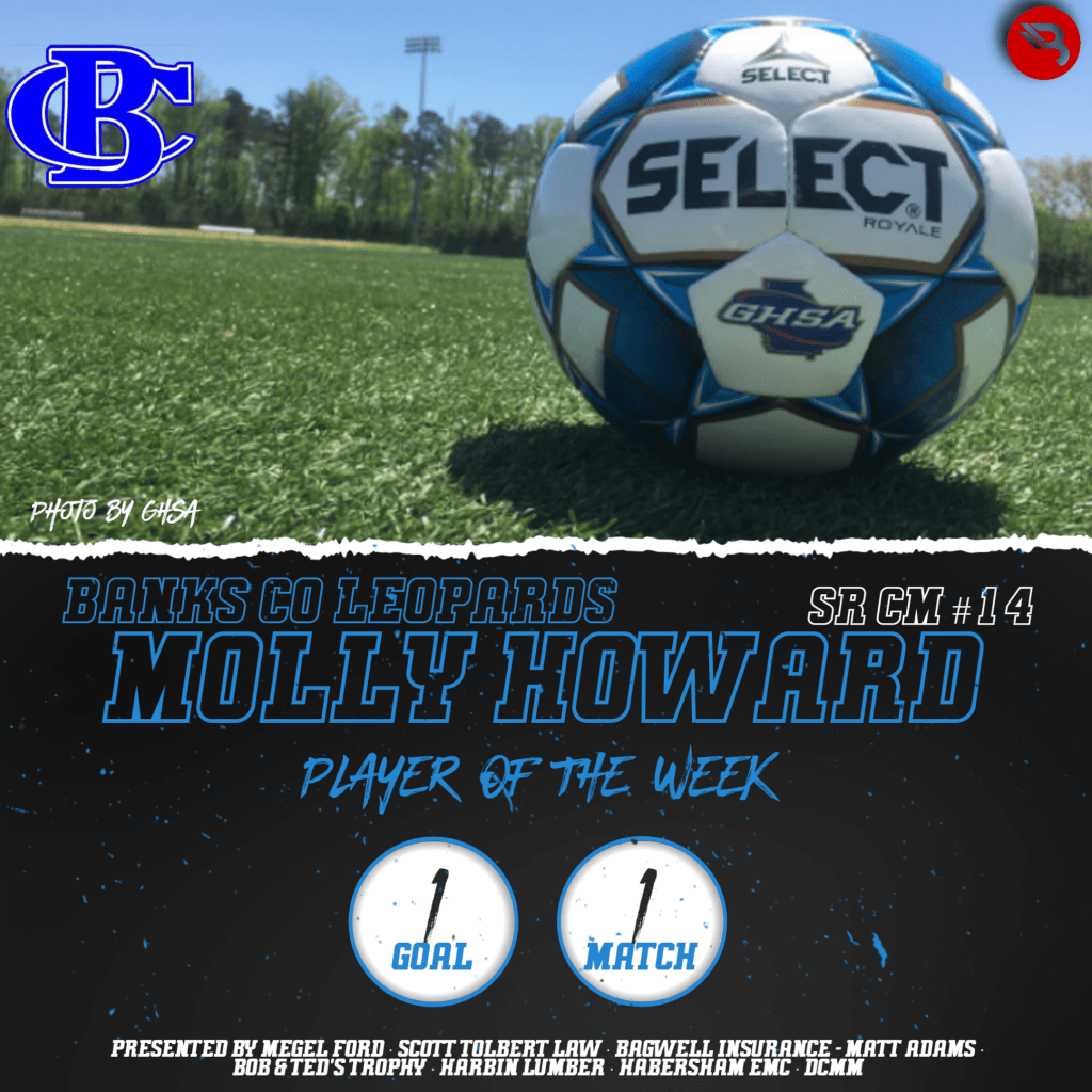 Banks County’s Molly Howard had a goal last week for the Lady Leopards. For the senior center mid, this is her first POW award.