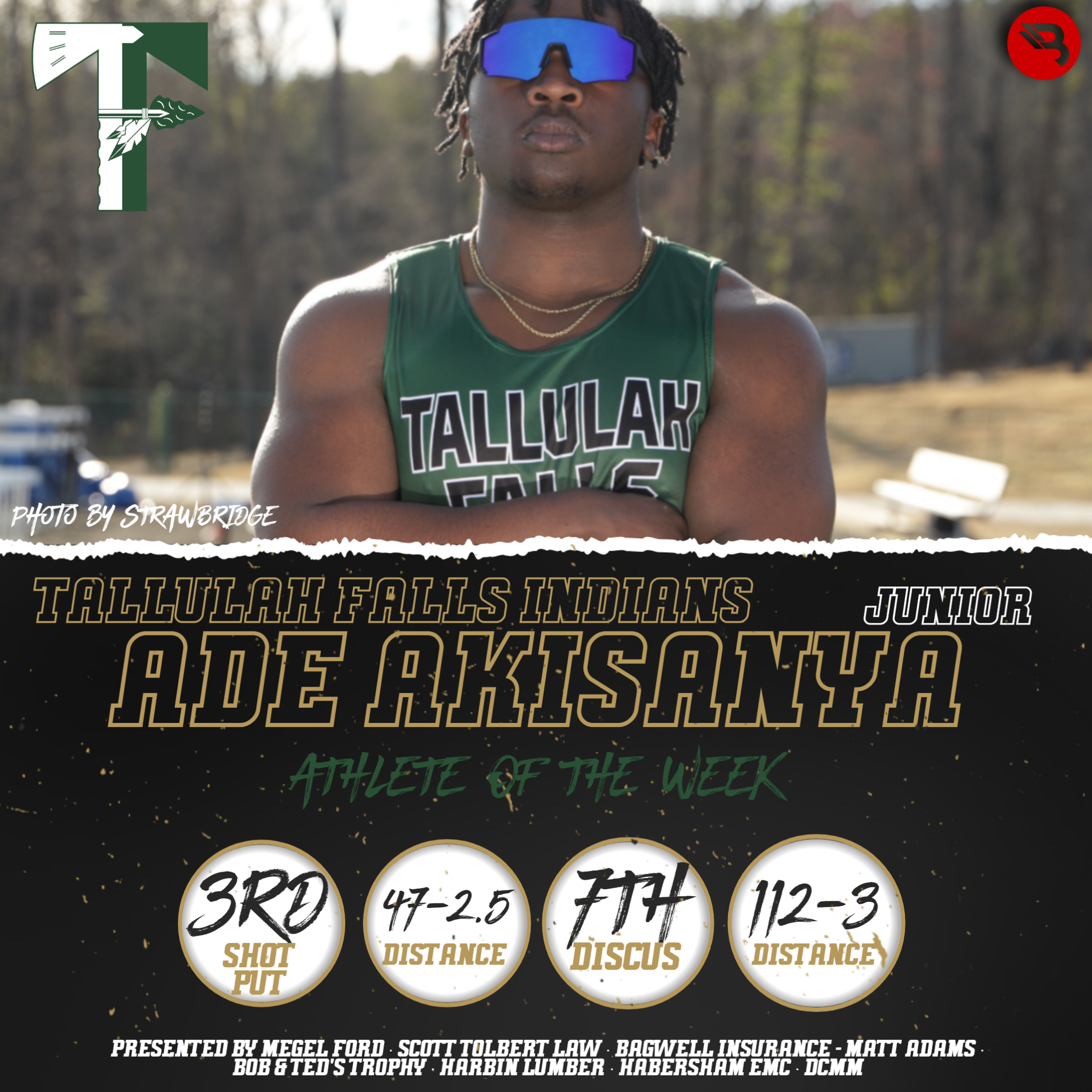 Ade Akisanya has been a big-time thrower for Tallulah Falls. The junior was 3rd in the shot put with a 47-2.5, then 7th in discus with a 112-3 at the GAC Invite. This is his first POW award.