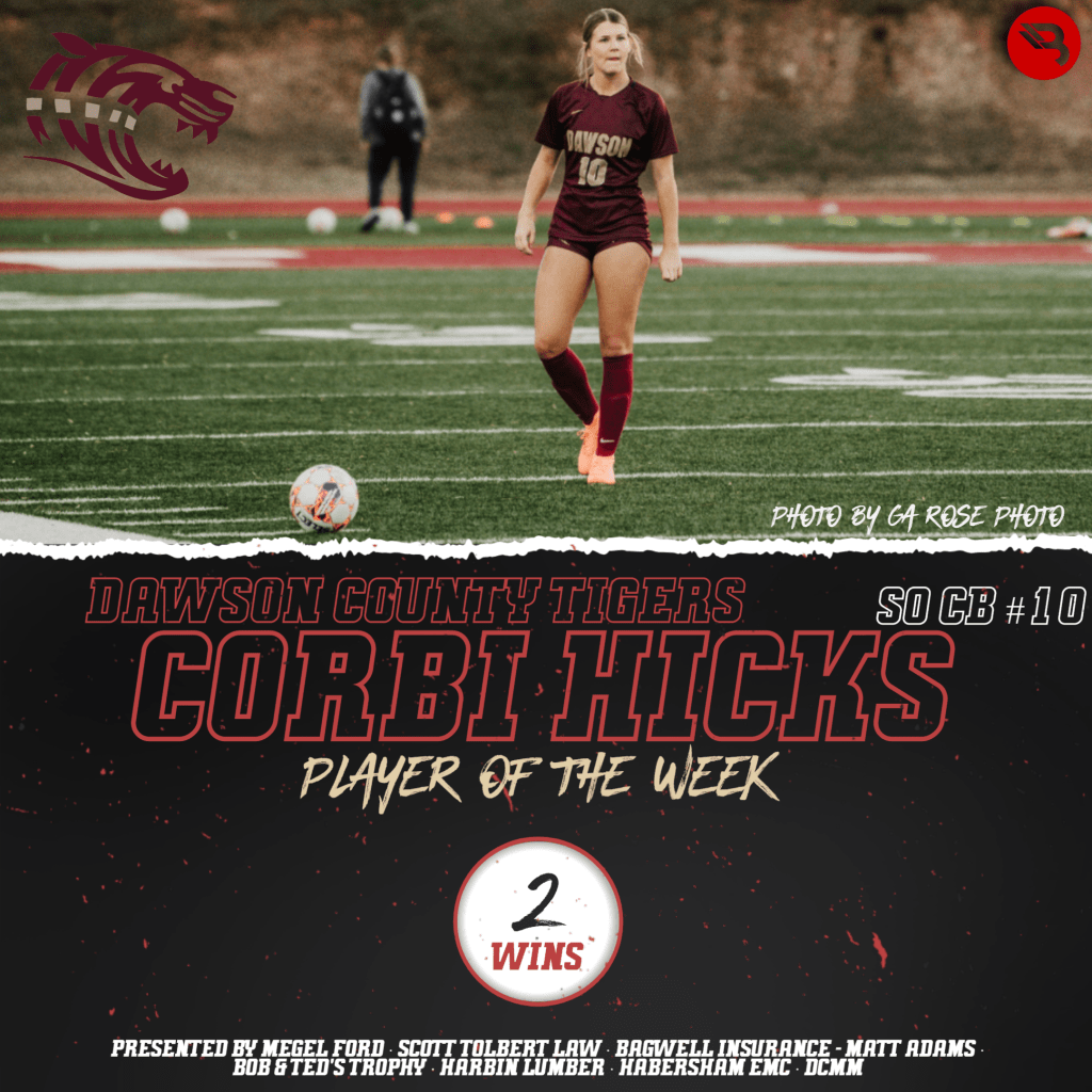 Dawson County has been on fire thusfar, and ranked #4 in the state. Top to bottom, this team has standouts. Meet Corbi Hicks. The sophomore center back played excellent on defense last week in 2 region wins for the Lady Tigers. This is her first POW award.