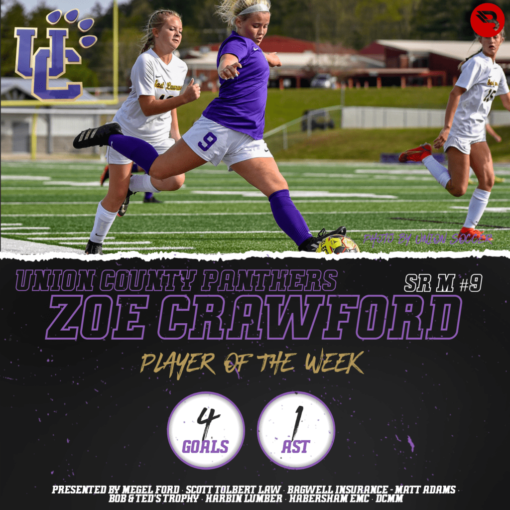 Zoe Crawford led the Lady Panthers offensively last week. The senior midfielder notched a hat trick with a 4-goal game, and added an assist. This is her second career POW award.