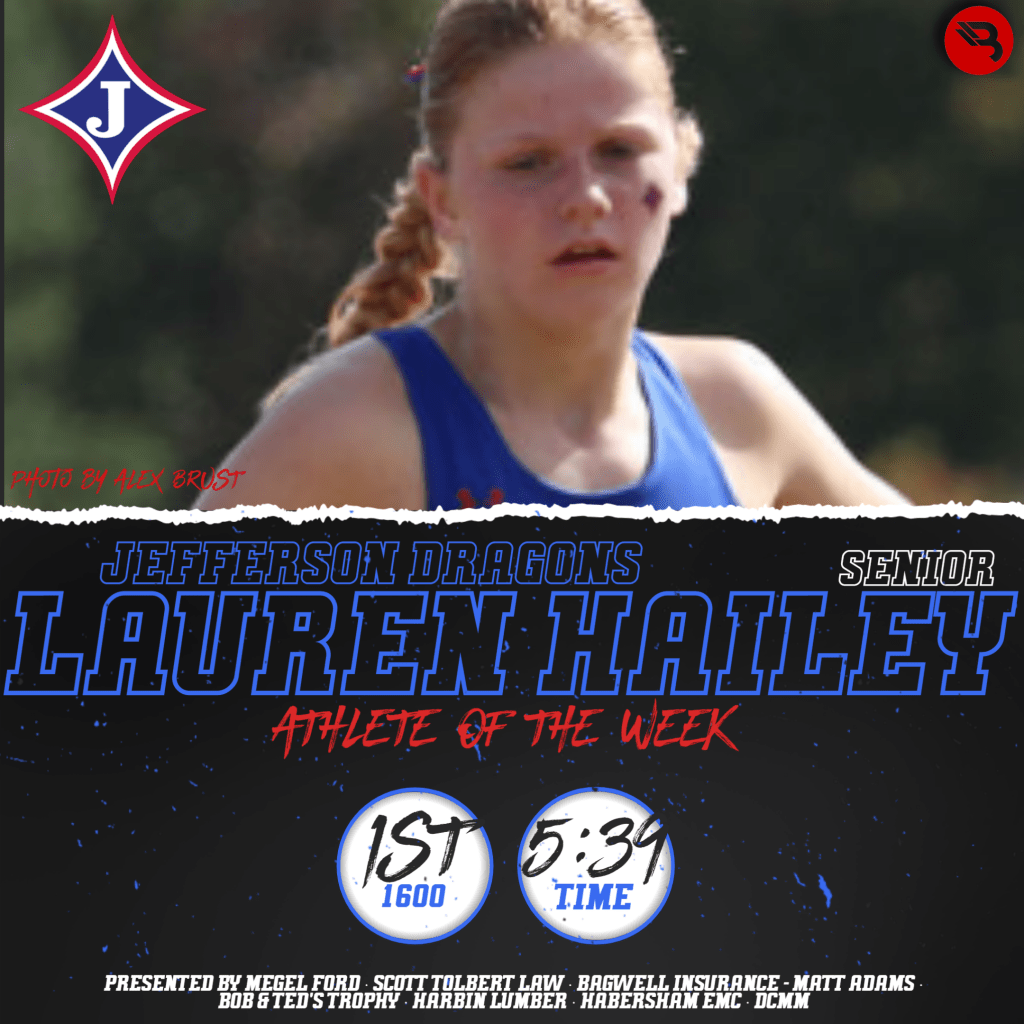Jefferson’s Lauren Hailey came in 1st in the 1600 last week for the Lady Dragons. She finished in 5:39, earning her first Athlete of the Week award.
