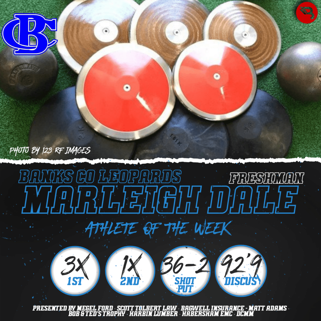 Marleigh Dale is having a breakout season as just a freshman. The thrower for Banks County had a few 1st-place finishes and one 2nd-place finish overall in two meets last week between shot put and discus. Her weekly-best in both was a 36-2 in shot put and 92’9 in discus. This is her first POW award.