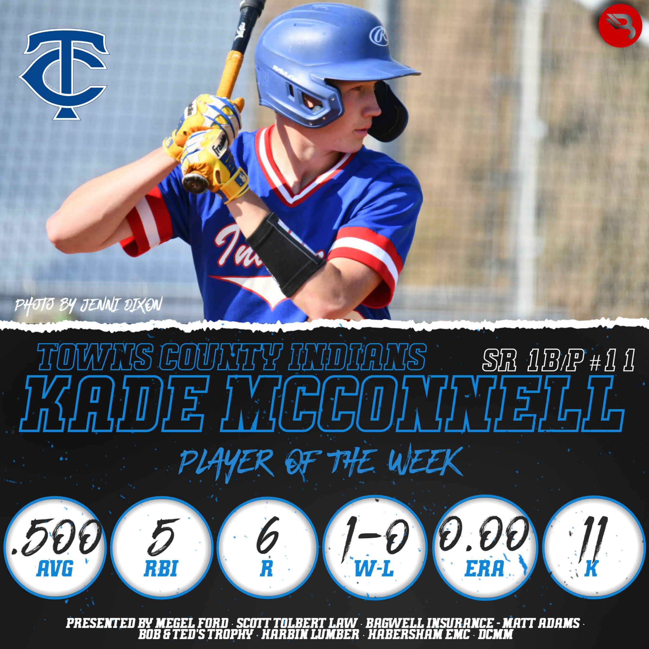 Kade McConnell had quite the stat line for Towns County. In 3 games last week for the Indians, the senior 1B/P was 1-0 on the bump with a complete game, 11-strikeout performance in a full 7 inning game. At the plate, he hit .500, going 7-for-14, registering 5 RBI, 6 runs scored, 2 doubles, and a triple. This is his third career POW award, and he is the 100th all-time winner from Towns County.