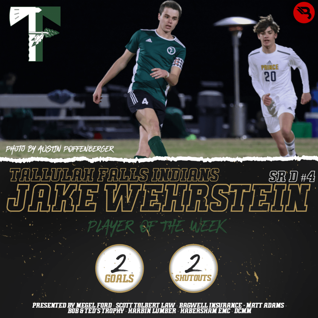 Jake Wehrstein is an All-State defender, and is a HUGE reason for the Tallulah Falls success over the past several years. He led the defense to staple down 2 shutouts last week, and the #2-ranked Indians star senior also contributed 2 goals. This is his third career POW award.