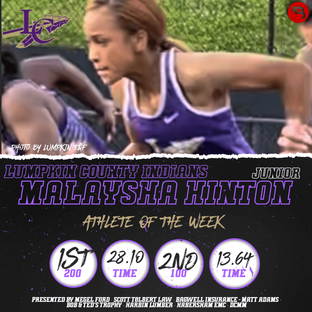 Malaysha Hinton takes her second POW award. The junior sprinter was 1st in the 200 with a 28.10, and 2nd in the 100 with a 13.64 last week for Lumpkin County.