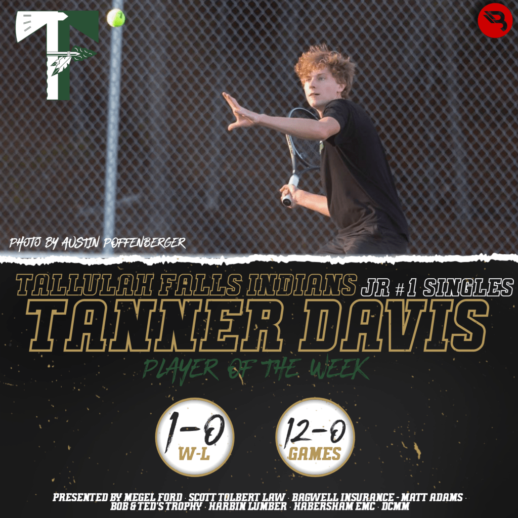 Tanner Davis has had quite the career at Tallulah Falls. Last week, the Indians #1 singles standout won his first round match 6-0, 6-0 to help get TFS to its third straight Sweet 16. This is his second career POW award.