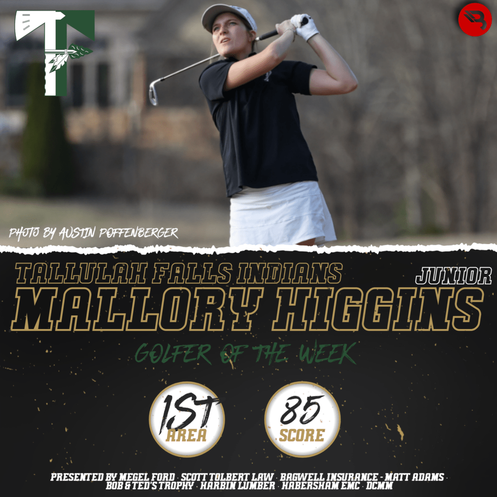 Junior Mallory Higgins shined for Tallulah Falls, leading the Lady Indians to an Area Championship. Her 85 also made her the individual champ, as she earns her third career POW award.