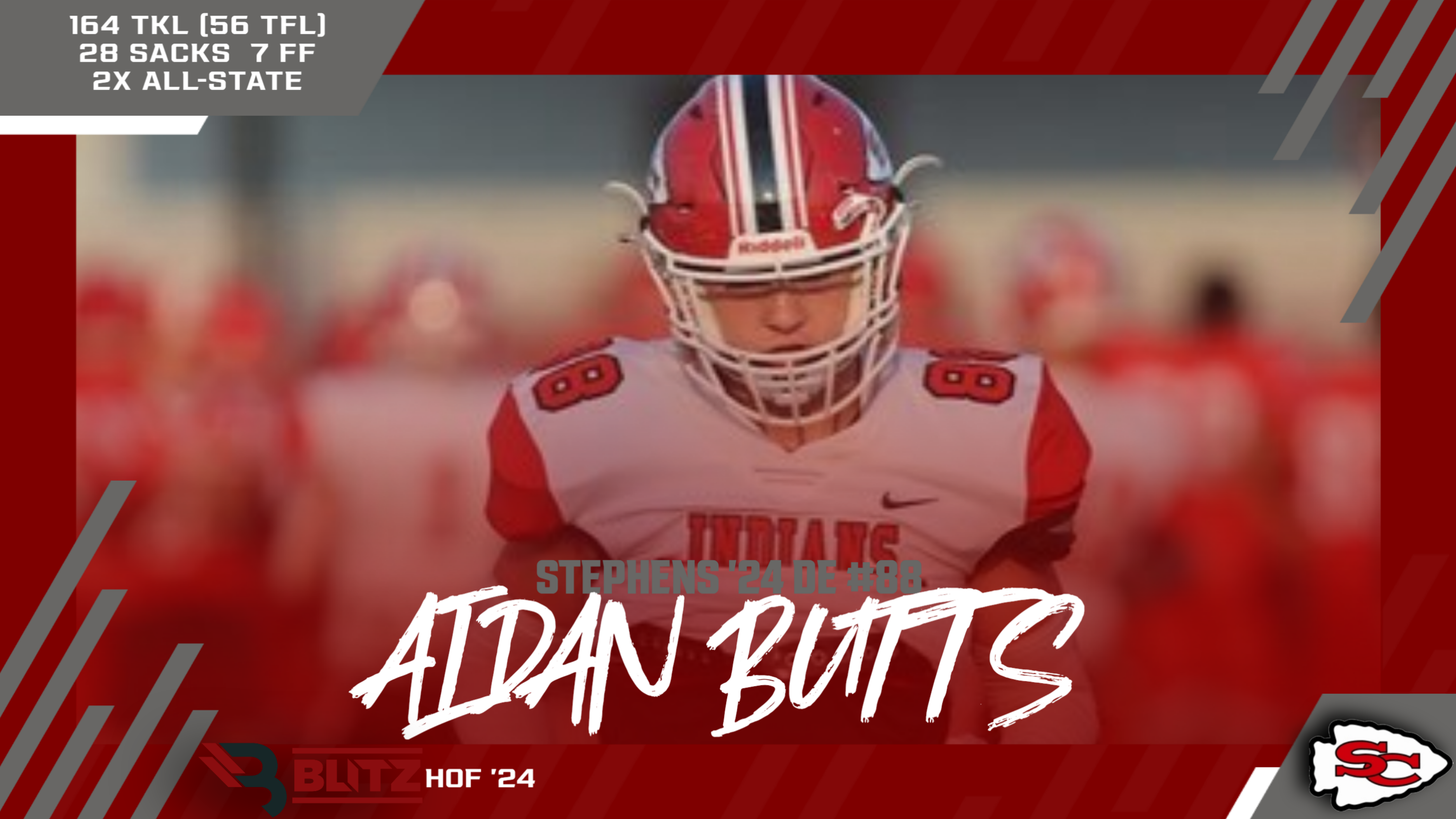 Aidan Butts was a force to be reckoned with for the Indians. The defensive end was a 2-time All-State selection, totaling 164 TKL (56 TFL), and closed his career with 28 Sacks and 7 forced fumbles. His senior year (2023) saw him go for 73 tackles (26 for loss) and 12 sacks, while he registered 75 tackles (26 for loss) and 16 sacks as a junior in 2022. Butts went on to play at Middle Tennessee State University. (30 votes, Producer’s Pass)