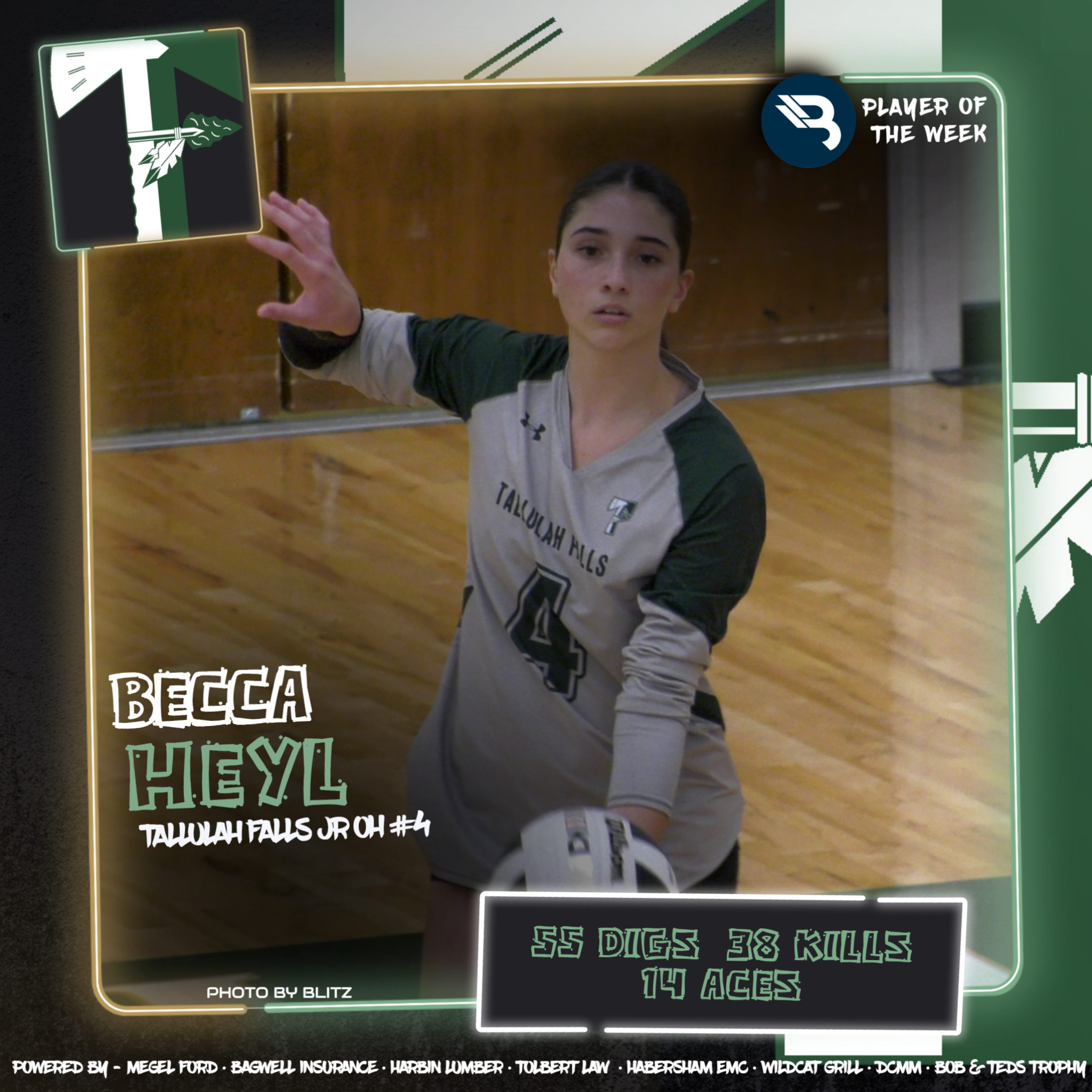 Becca Heyl is getting it done so far for Tallulah Falls! The junior OH had 55 digs, 38 kills, and 14 aces in 4 matches for the Lady Indians. This is her first POW award.