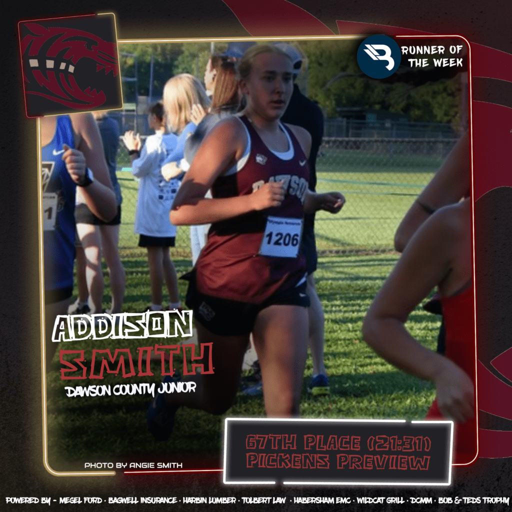 Addison Smith had another solid run in what’s becoming quite an impressive career. The Dawson County junior finished 67th in a competitive field at the Pickens Preview, finishing at 21:31. This is her 3rd ROW award.