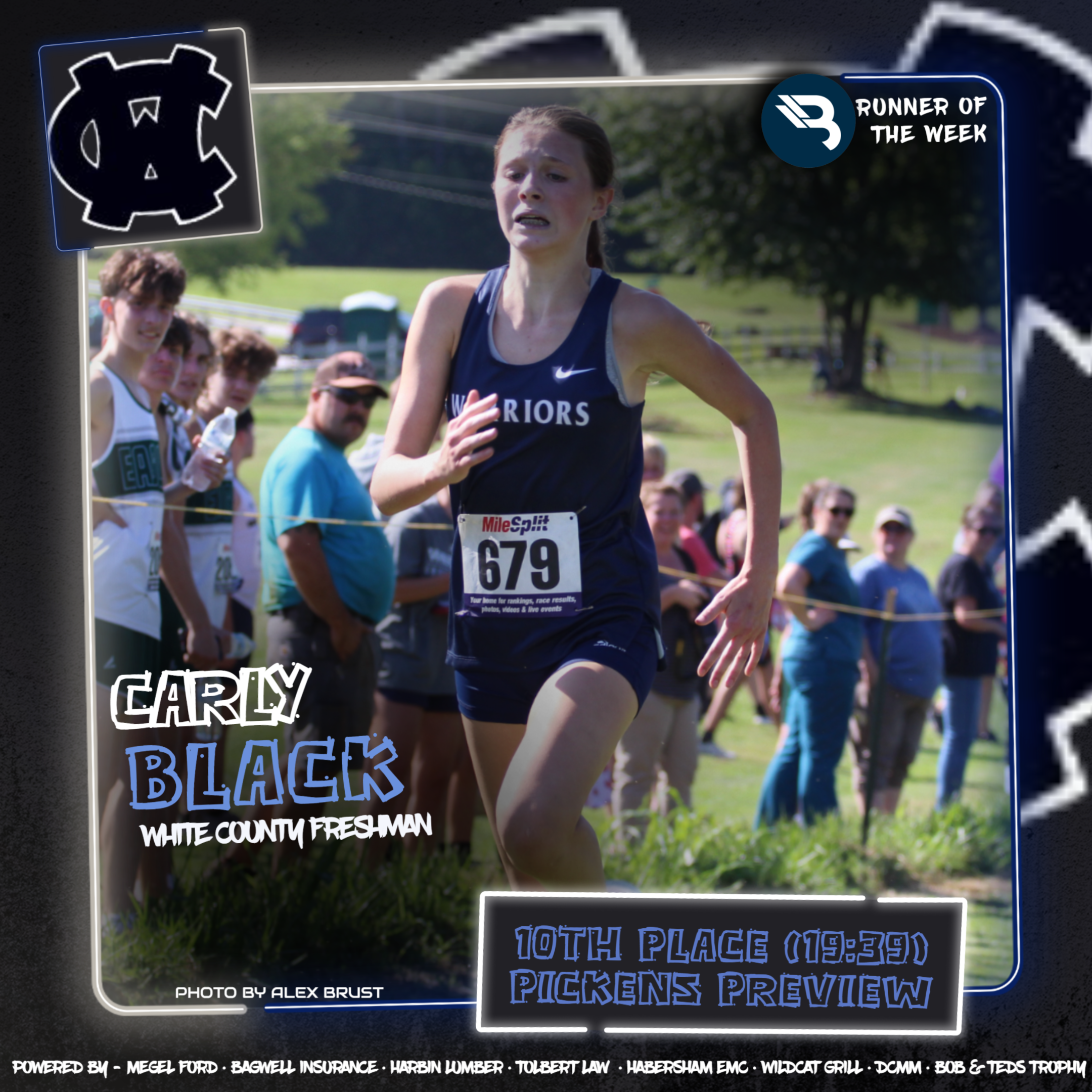 Carly Black might be the real deal! The White County freshman finished 10th last week at the Pickens Preview, crossing the line at 19:39. This is her first BLITZ award.