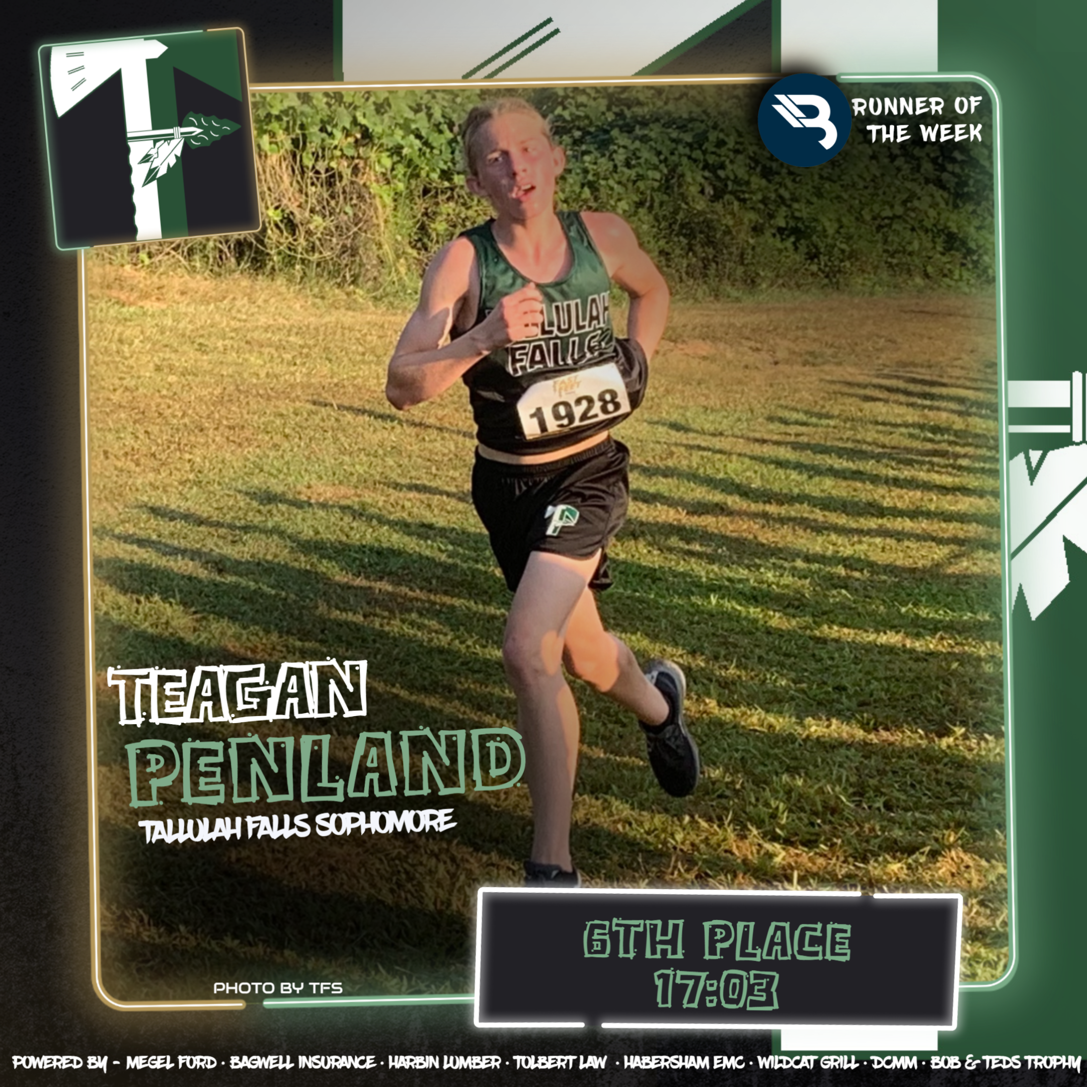 Sophomore Teagan Penland is not only proving last year was no fluke, he’s putting those times in the rearview mirror. Tallulah Falls’ most consistent runner came in 6th-place last week in the North Georgia Championships with a time of 17:03. This is his second ROW award.