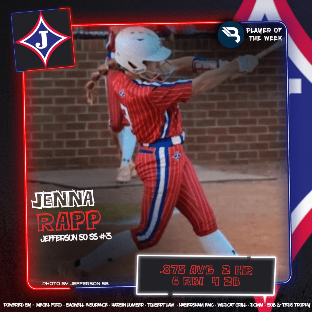 Sophomore Jenna Rapp is picking up right where she left off last season. The shortstop got it done for Jefferson Lady Dragons in the field and at the plate. She hit .875 for the week (7-for-8), with 2 HR, 6 RBI, and 4 doubles. She added several big plays defensively, and earns her second POW award.