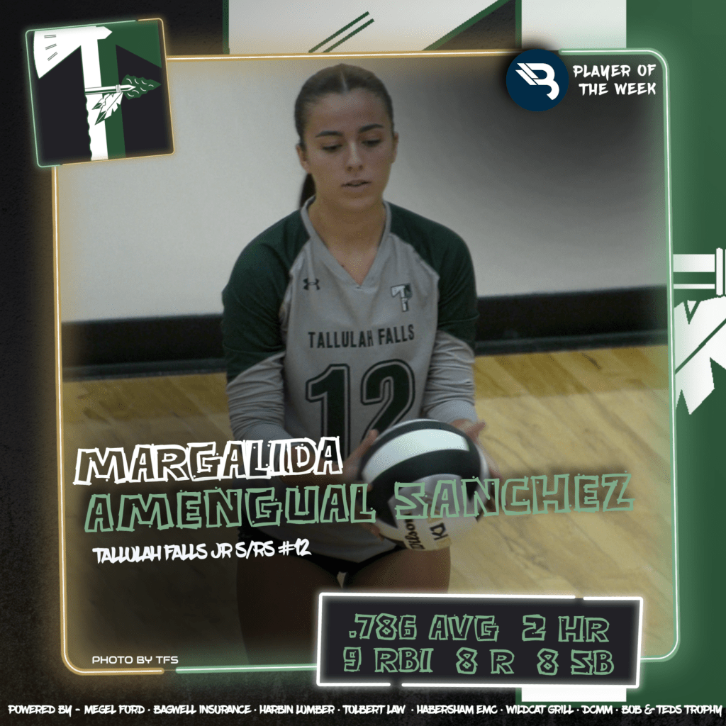 Tallulah Falls junior Margalida Amengual Sanchez put up ridiculous numbers for the #10 Lady Indians in 4 matches last week. The setter had 55 assists, 37 digs, 25 kills, and 12 aces. This is her first POW award.