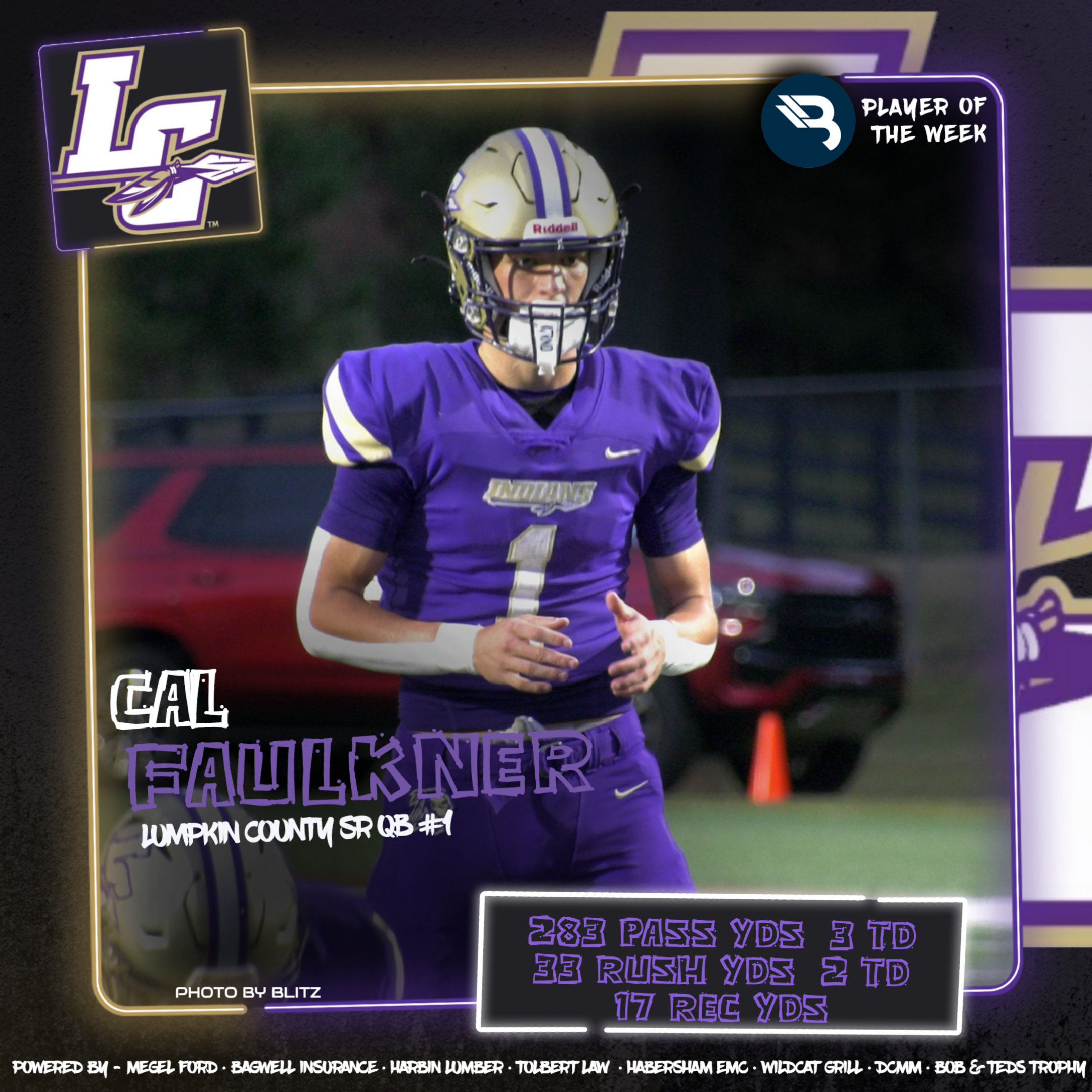 Cal Faulkner had his best game of the season. The Lumpkin County 3-star QB, committed to Georgia Tech, passed for 283 yards and 3 TDs, while adding 33 rushing yards and 2 more TD. He also hauled in a few catches for 17 yards. This is his 8th career POW award.