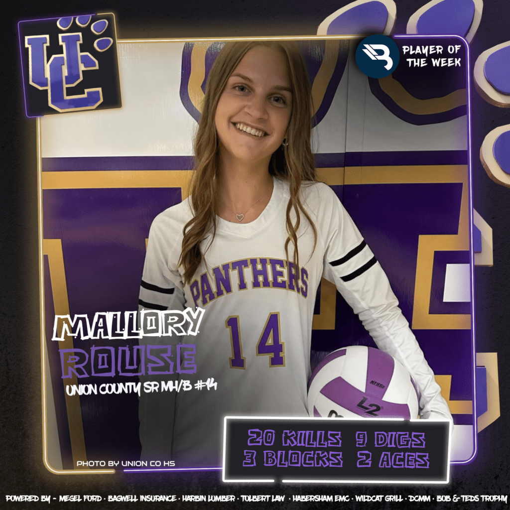 Mallory Rouse collected 20 kills, 9 digs, 3 blocks, and 2 aces for Union County last week. The senior MH earns her second POW award.