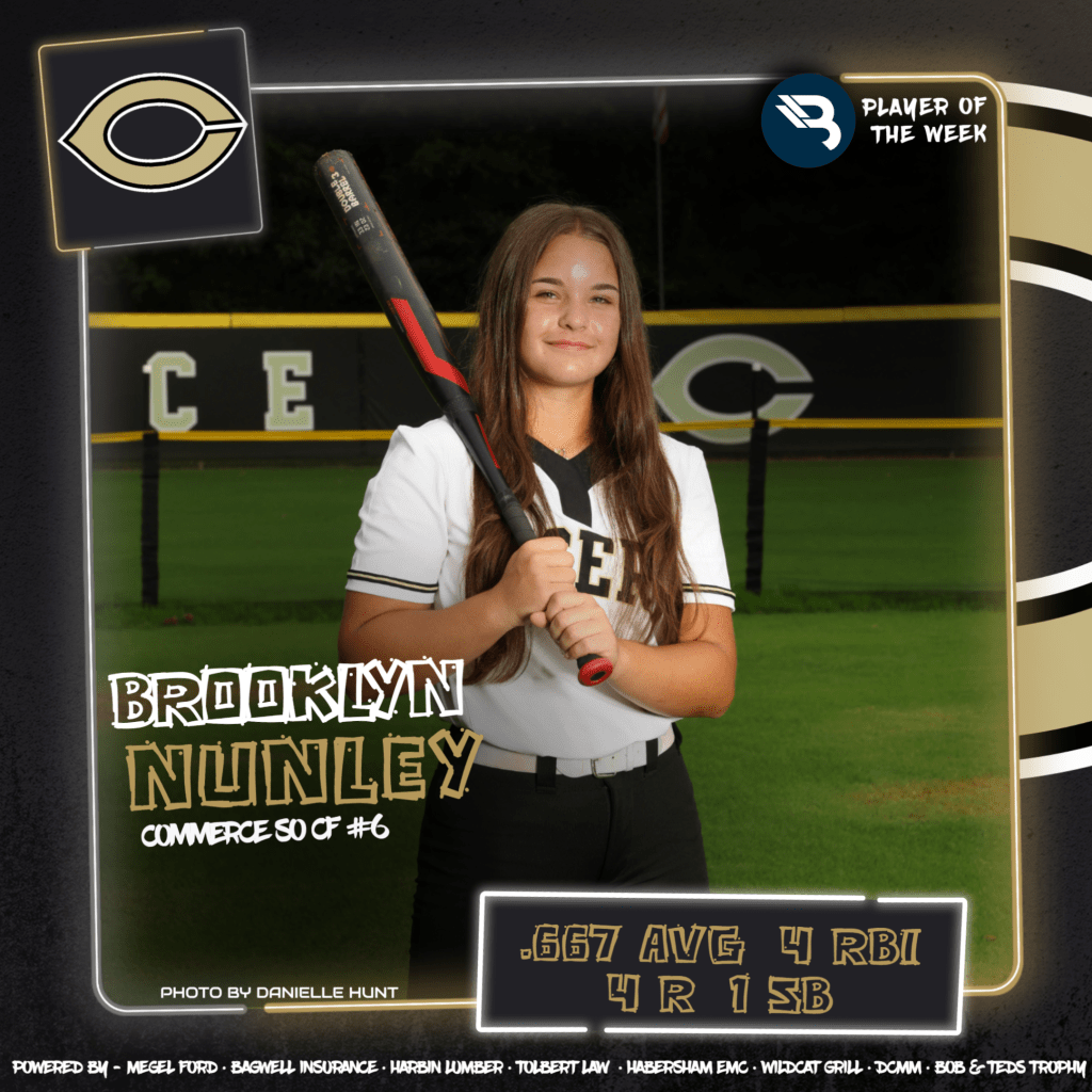Brooklyn Nunley had a solid performance for Commerce last week. The sophomore outfielder/pitcher hit .667 (6-for-9), driving in 4 runs and scoring 4, swiping a base as well. This is her first POW award.