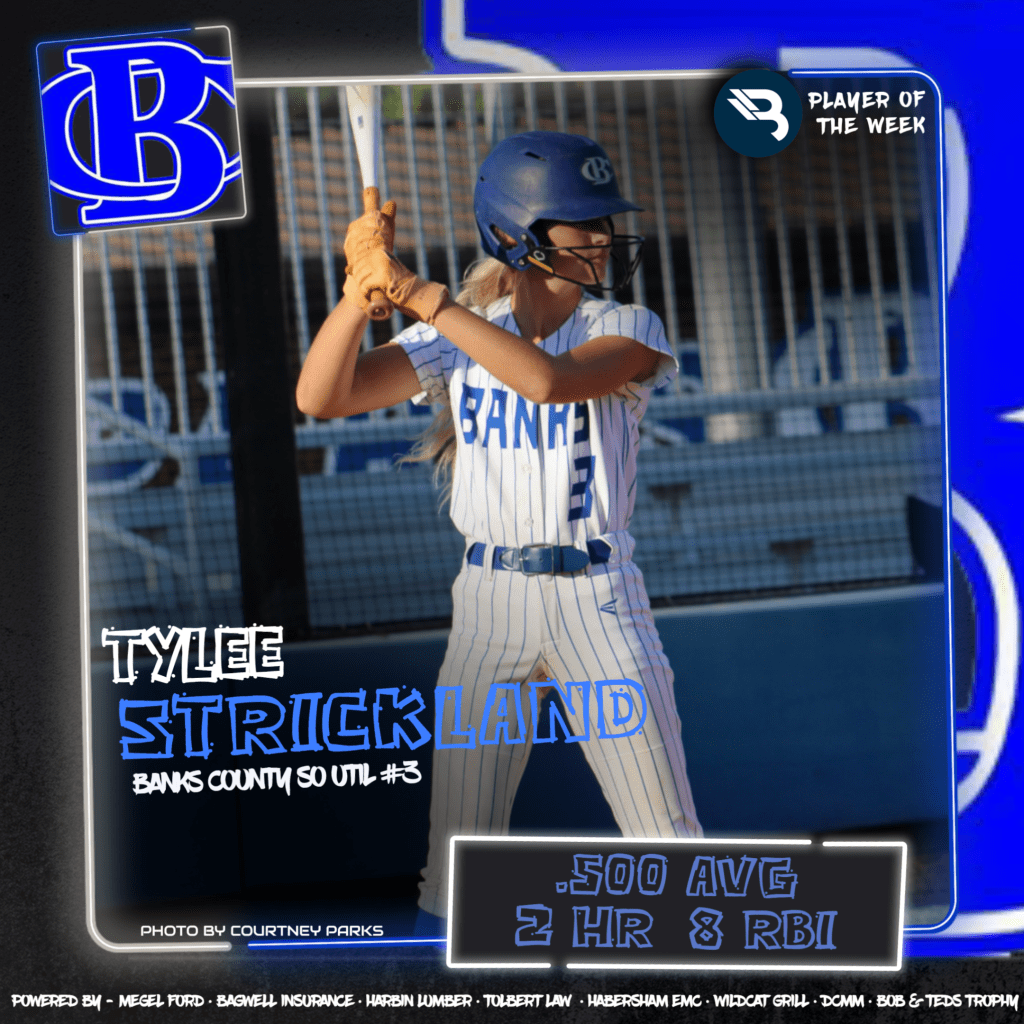Banks County’s latest emerging talent is Tylee Strickland. The sophomore utility player batted .500 last week with 2 homers and 8 RBI, adding a walk as part of her standout efforts. This is her first POW award.