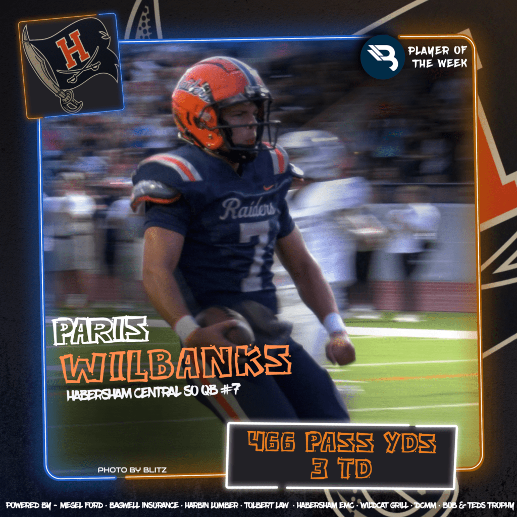 Not bad to be getting your second POW award after not starting as QB1 to open the season. Paris Wilbanks was unreal for the Raiders in their tough loss at Winder. The sophomore was 31-for-42 passing (74%) for 466 yards and 3 TD. The yardage sets a Habersham Central single-game passing record.