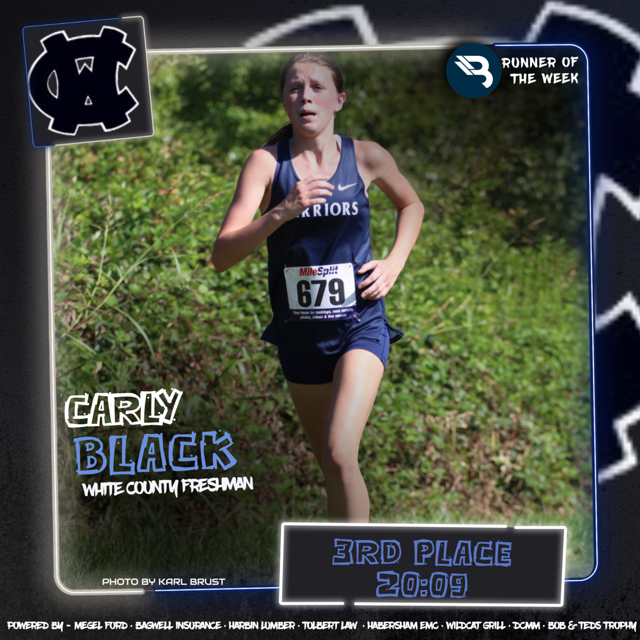 The freshman phenom is at it again. Carly Black for White County came in 3rd place with a 20:09 at the Mountain Invite last week, earning her second POW award.