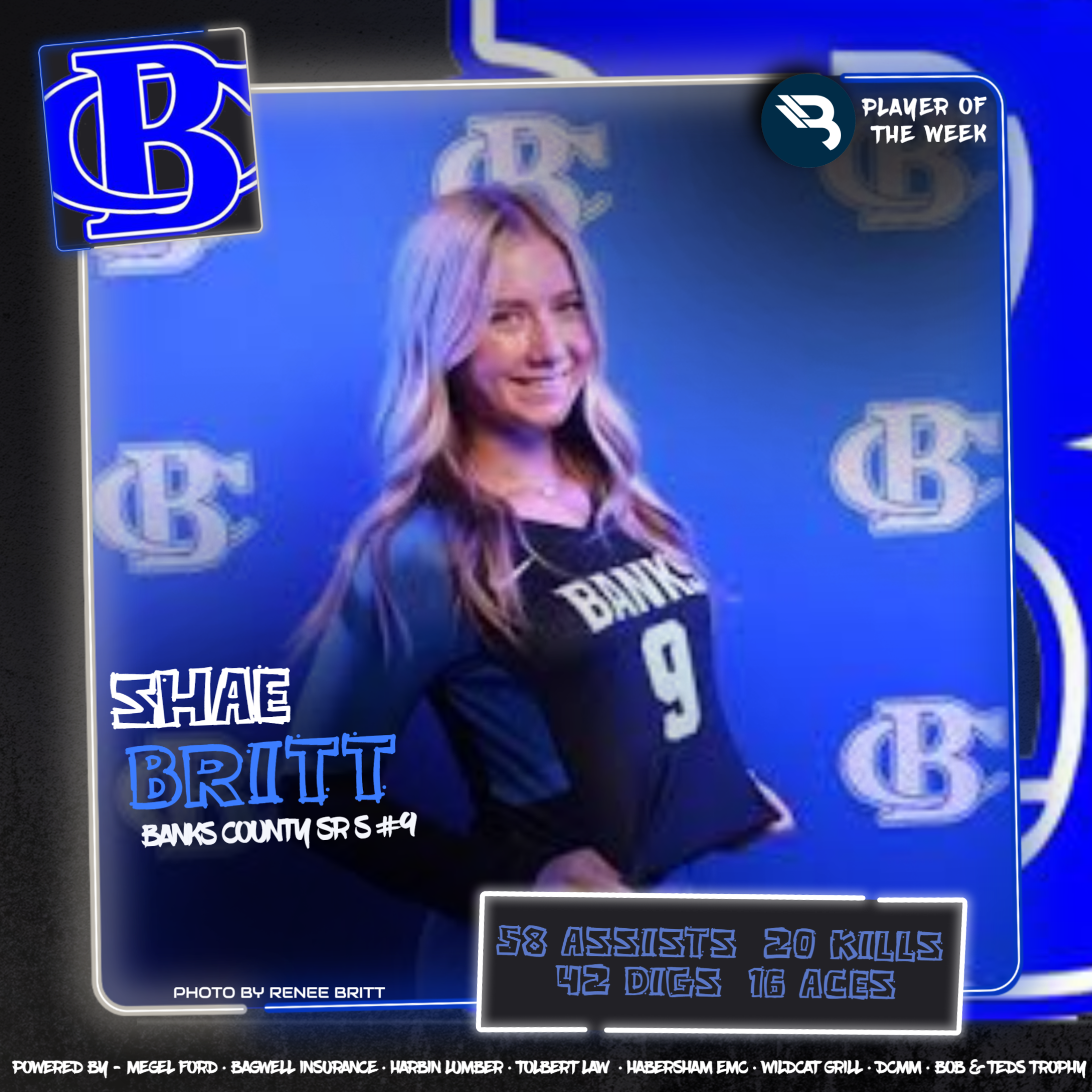 Shae Britt is putting the finishing touches on a great career at Banks County. The senior setter had 58 assists, 42 digs, 20 kills, 16 aces, and a block last week for the Lady Leopards. This is her second POW award.
