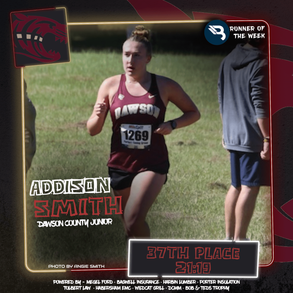 Addison Smith is fast! The junior for Dawson County continues her impressive career, earning her 4th ROW award. She came in 37th place among a crowded field at the 22nd Annual Coach Wood Invitational, crossing the line at 21:19.
