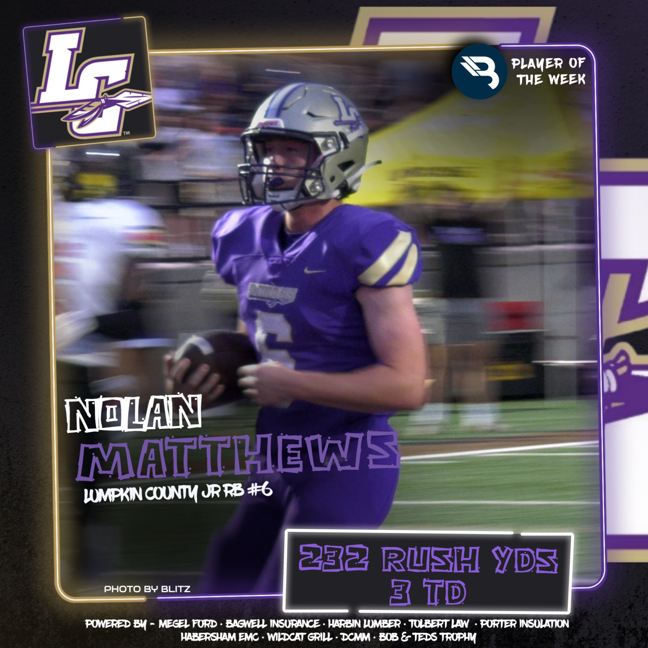 Nolan Matthews took over in the win over Dawson County, running scorched earth for 232 yards and 3 TD. The junior now has 958 rushing yards 12 TD rushing, and 82 receiving yards and another score this season. This is his second career POW award.