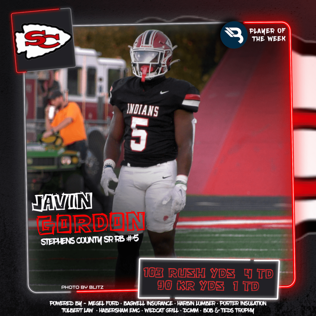 The BLITZ Football Players of the Week are Everett Rudeseal (Habersham Central) and Javin Gordon (Stephens County). Rudeseal won the Fan Vote with 5,968 of the 9,483 total votes. Gordon was the BLITZ Pick.