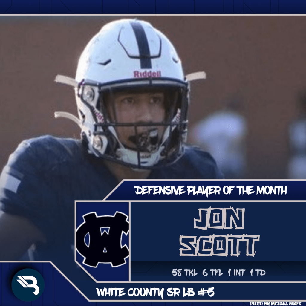 Throughout the football season, we will recognize a Defensive Player of the Month (Fan Vote winner and BLITZ pick) for each 4-week span. The Defensive Players of the Month for Weeks 9-12 are Jon Scott (White County) and Connor Bagley. Scott won the Fan Vote with 10,905 of the 23,276 total votes. Bagley was the BLITZ pick.