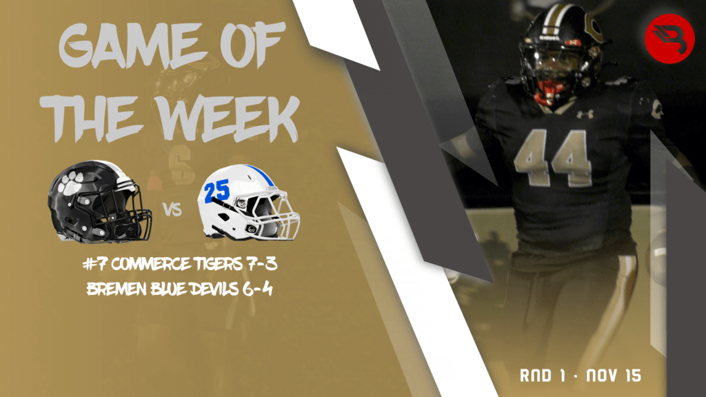 RECORDS: #7 Commerce Tigers (7-3; 5-1 in 8-A DI) vs Bremen Blue Devils (6-4; 4-2 in 6-A DI)