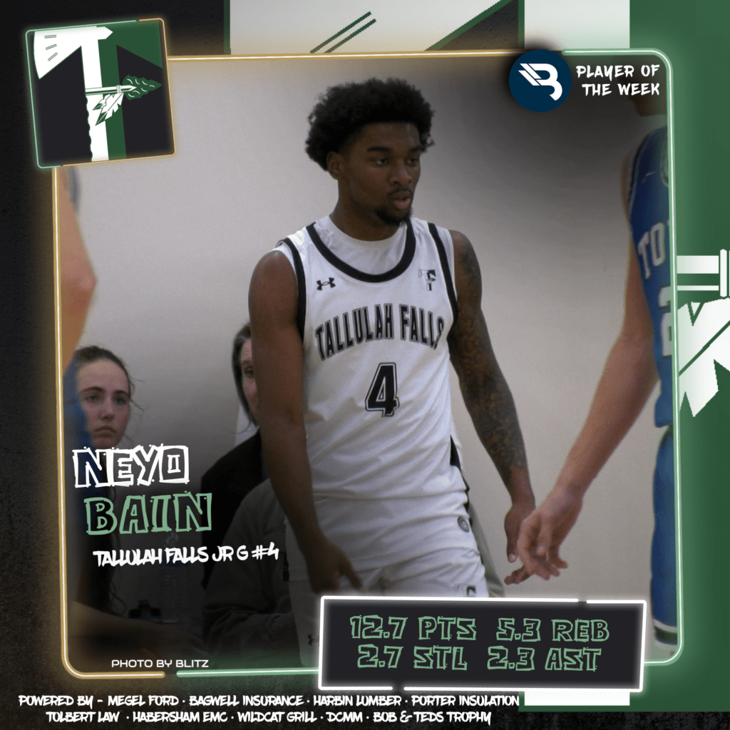 The BLITZ Boys Basketball Players of the Week are Neyo Bain (Tallulah Falls) and Jet Black (Stephens County). Bain won the Fan Vote with 2,310 of the 2,456 total votes. Black was the BLITZ Pick.