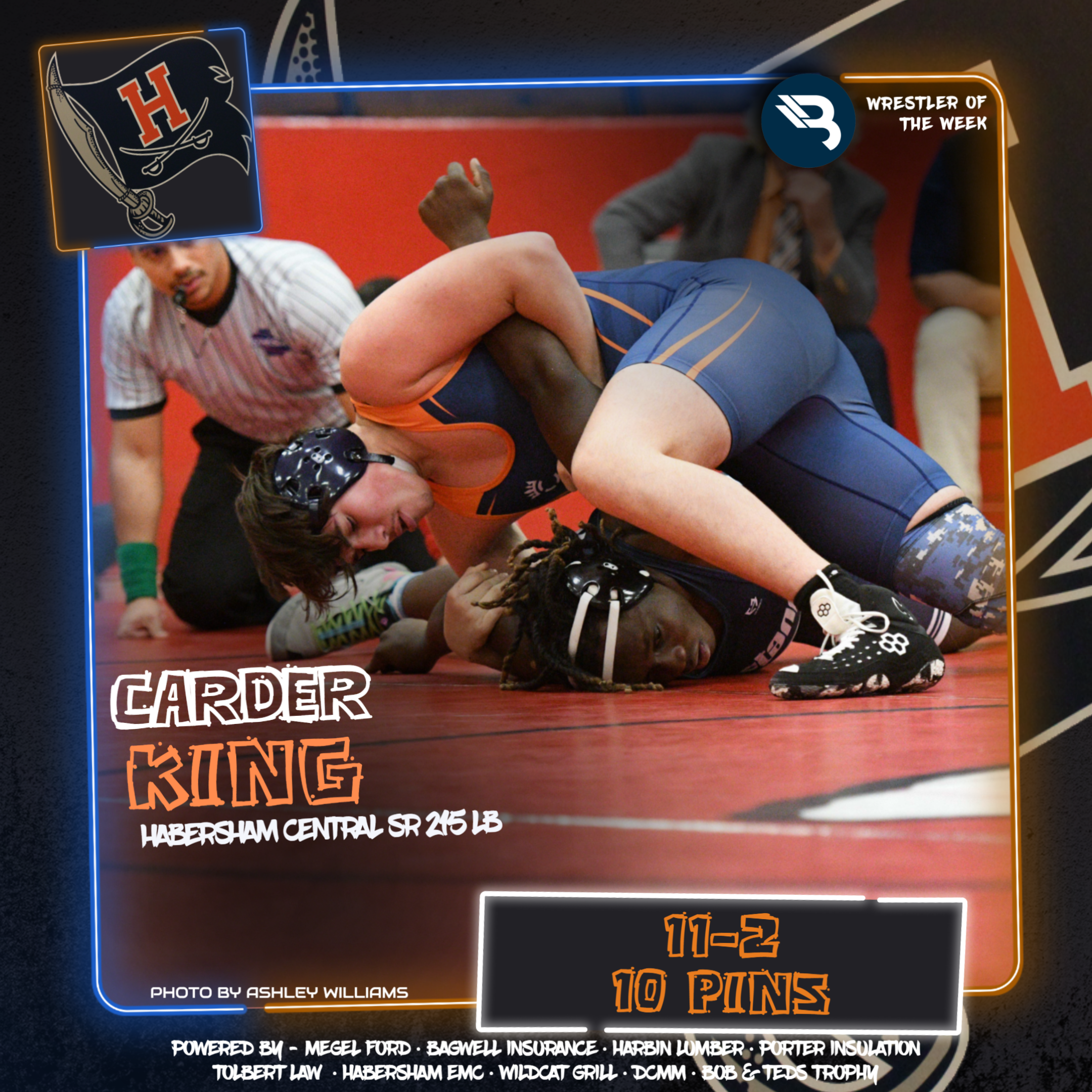 Carder King has gone 11-2 thus far, with 10 pins and one win by major decision. The senior at 215 LB takes his first WOW award.