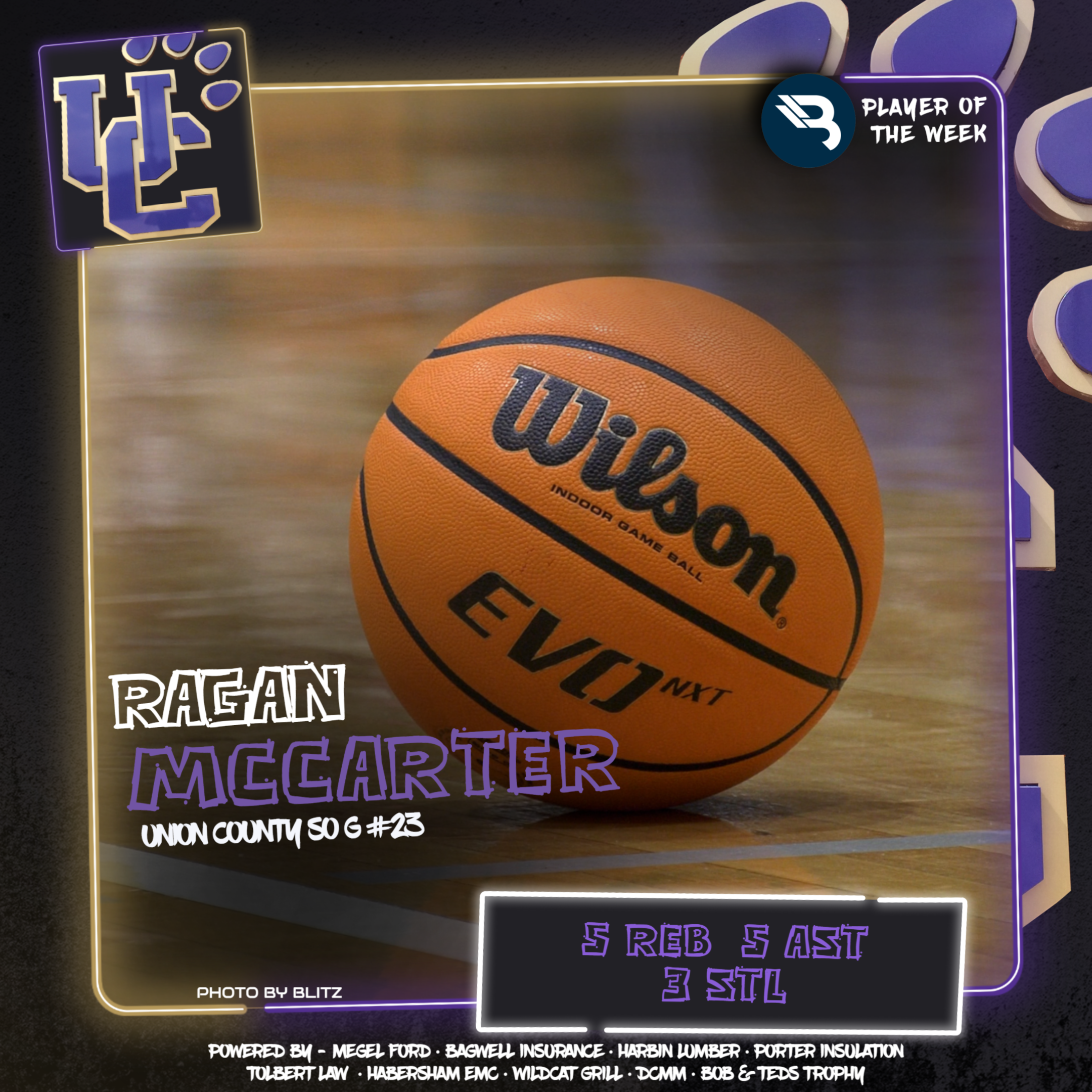 Ragan McCarter did the dirty work for Union County last week. The Lady Panthers’ sophomore guard hauled in 5 boards, dished out 5 assists, and swiped 3 steals. This is her first POW award.