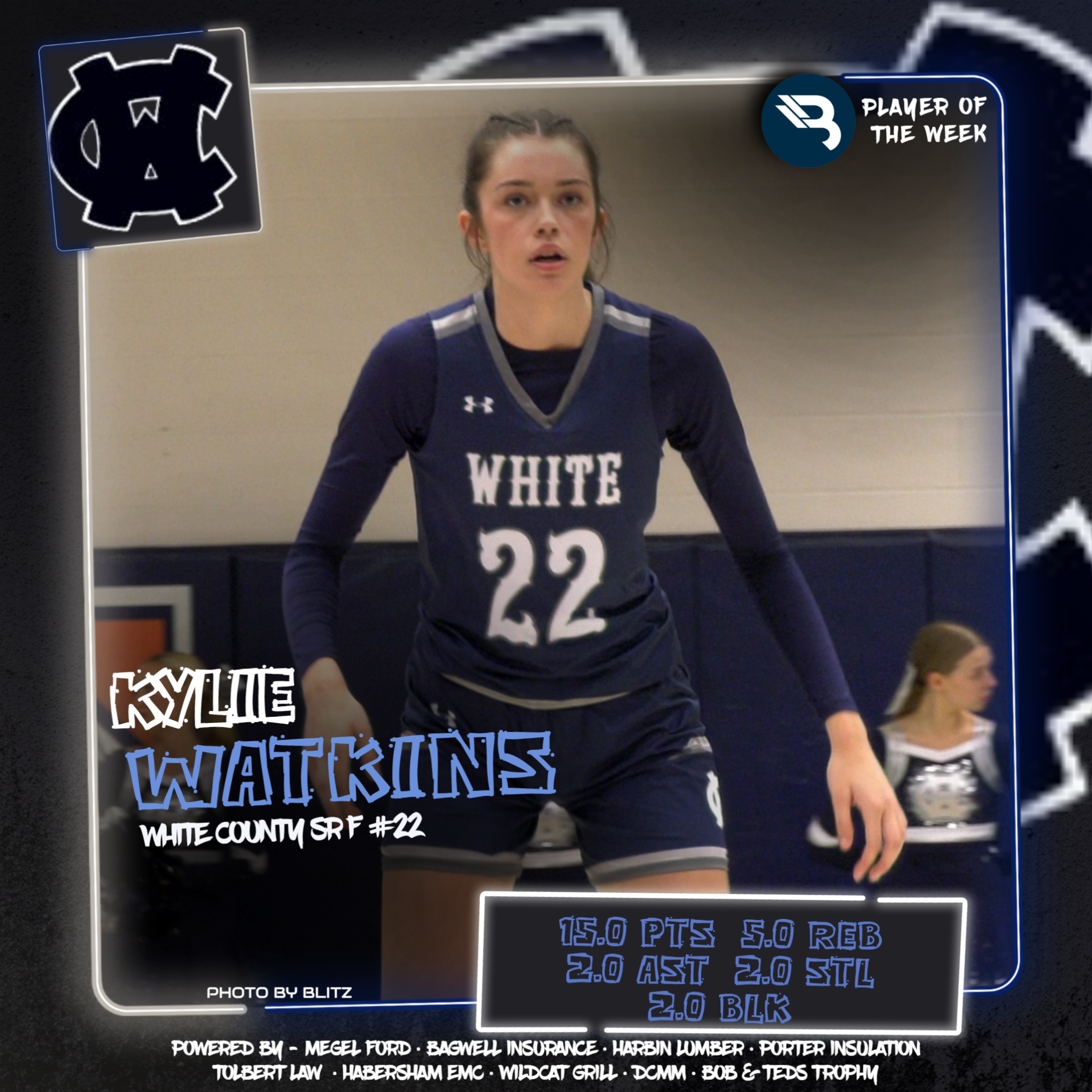 Kylie Watkins’ incredible career continues. The senior forward went for 15.0 points, 5.0 boards, 2.0 assists, 2.0 steals, and 2.0 blocks in 2 games for the Lady Warriors, ranked #3 in the state. The White County star takes her 5th POW award.