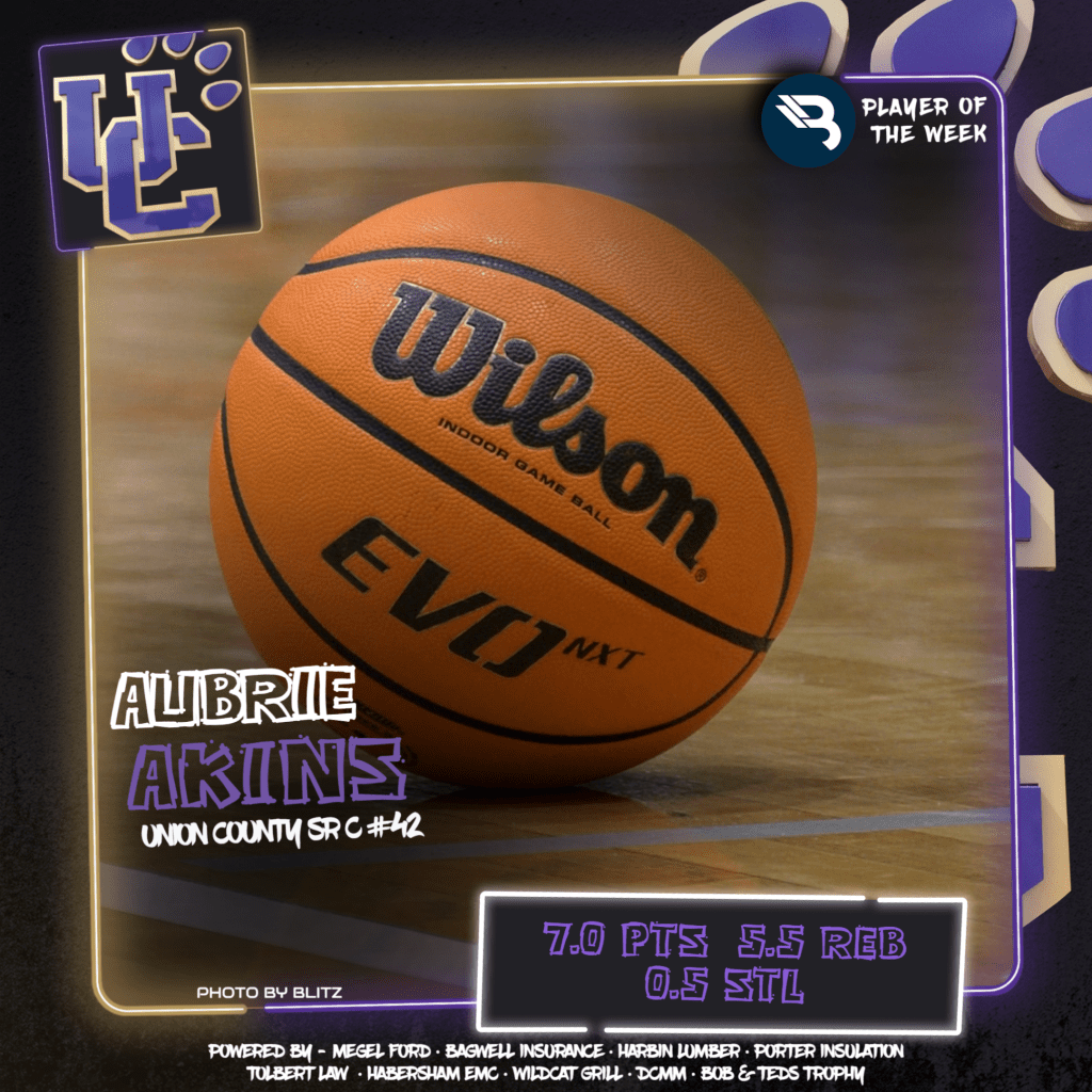 Union County’s Aubrie Akins posted a stat line of 7.0 points, 5.5 rebounds, and 0.5 steals from the center position in 2 games last week for the Lady Panthers. This is the senior’s first POW award.