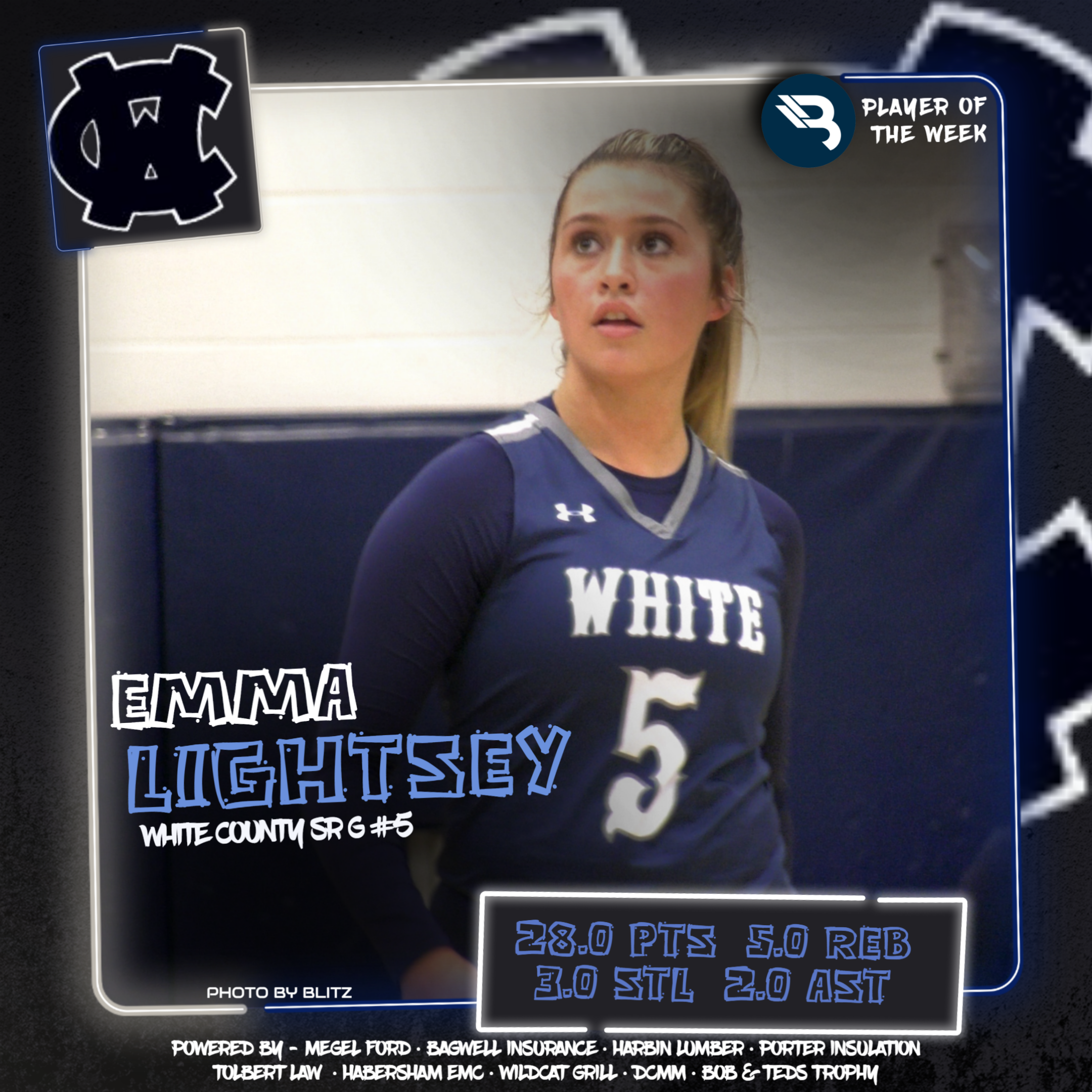 White County All-State senior guard Emma Lightsey had another stellar week for the #3-ranked White County Lady Warriors. She averaged 28 points, 5 rebounds, 3 steals, and 2 assists per game, earning her 4th career POW award.