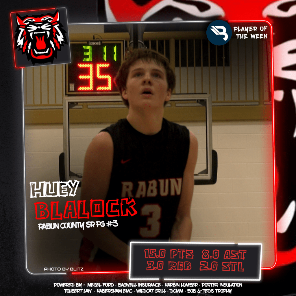 The BLITZ Boys Basketball Players of the Week are Neyo Bain (Tallulah Falls), Enzo Combs (Habersham Central), and Huey Blalock (Rabun County). Bain won the Fan Vote with 12,109 of the 35,014 total votes. Both Combs and Blalock were the BLITZ Picks.
