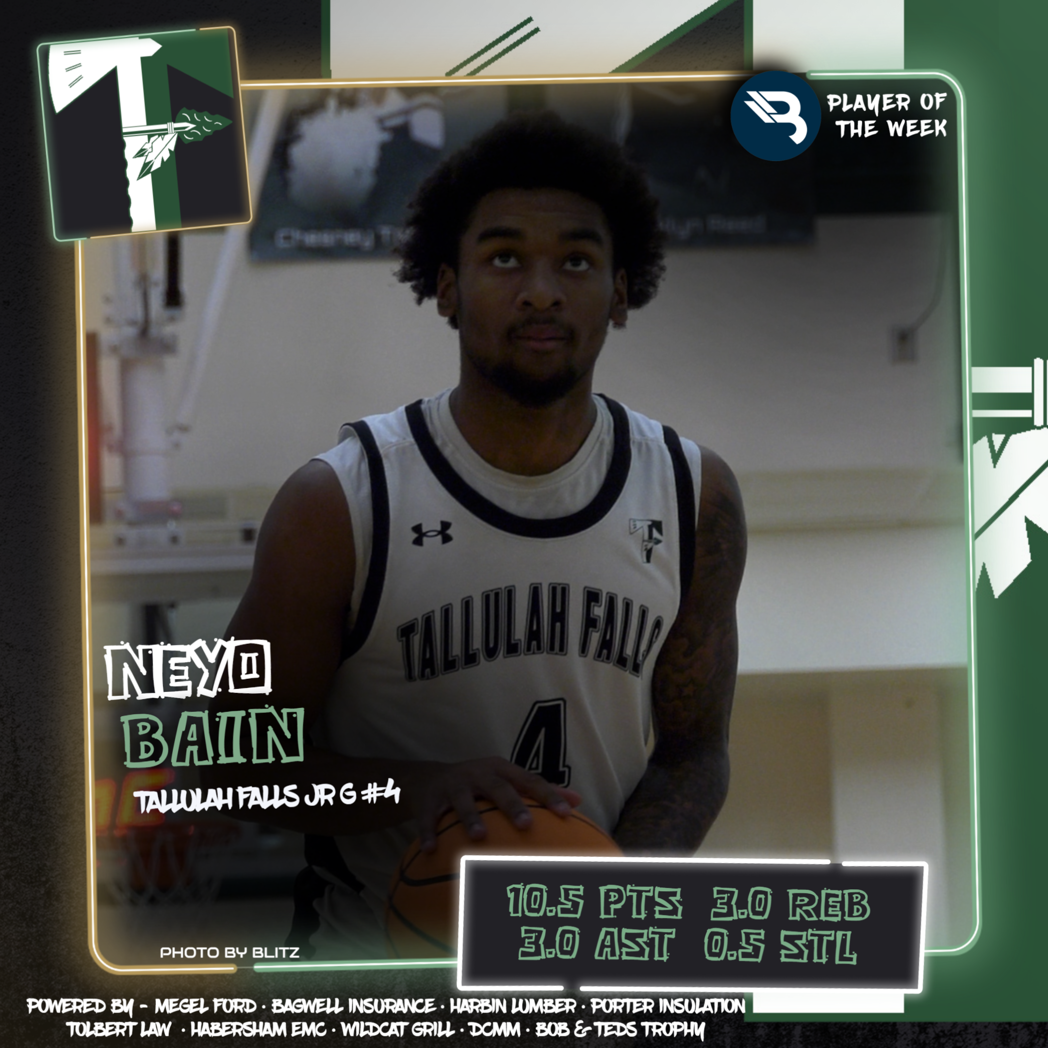 The BLITZ Boys Basketball Players of the Week are Neyo Bain (Tallulah Falls) and Huey Blalock (Rabun County). Bain won the Fan Vote with 9,616 of the 15,004 total votes. Blalock was the BLITZ Pick.