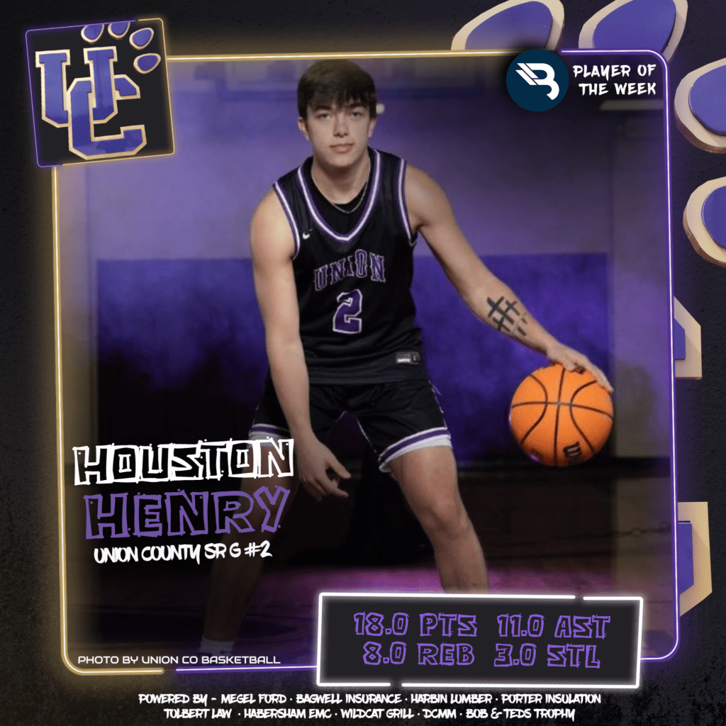For the 3rd time this year and 7th in his career, Houston Henry grabs a POW award. Well-deserved, too! The senior guard put up amazing numbers for the #4-ranked Union County Panthers last week, going for 18.0 points, 11.0 assists, 8.0 rebounds, and 3.0 steals.