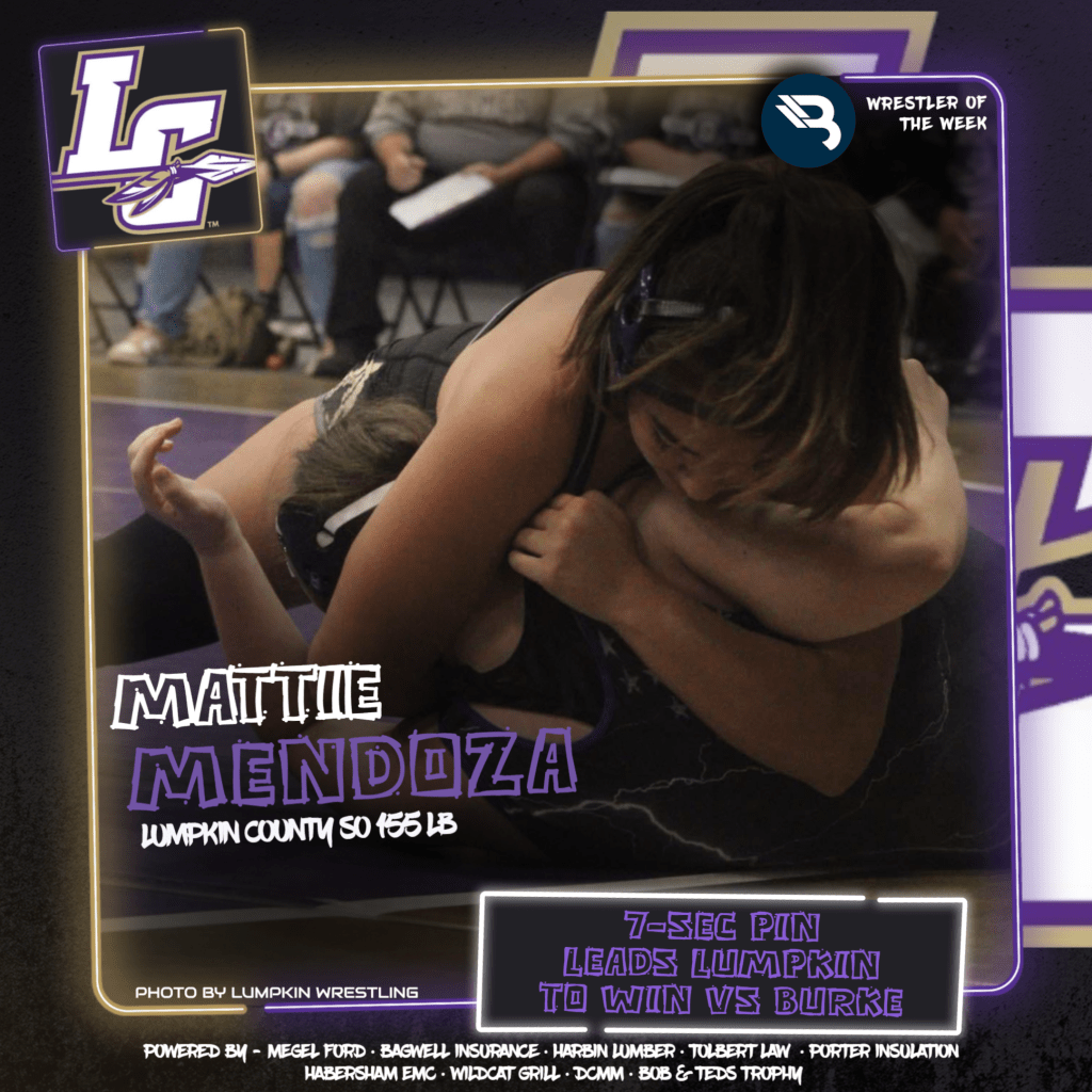 Lumpkin County sophomore Mattie Mendoza came up clutch with a 7-second pin to propel the Lady Indians over Burke County. Mendoza earns her first BLITZ award.