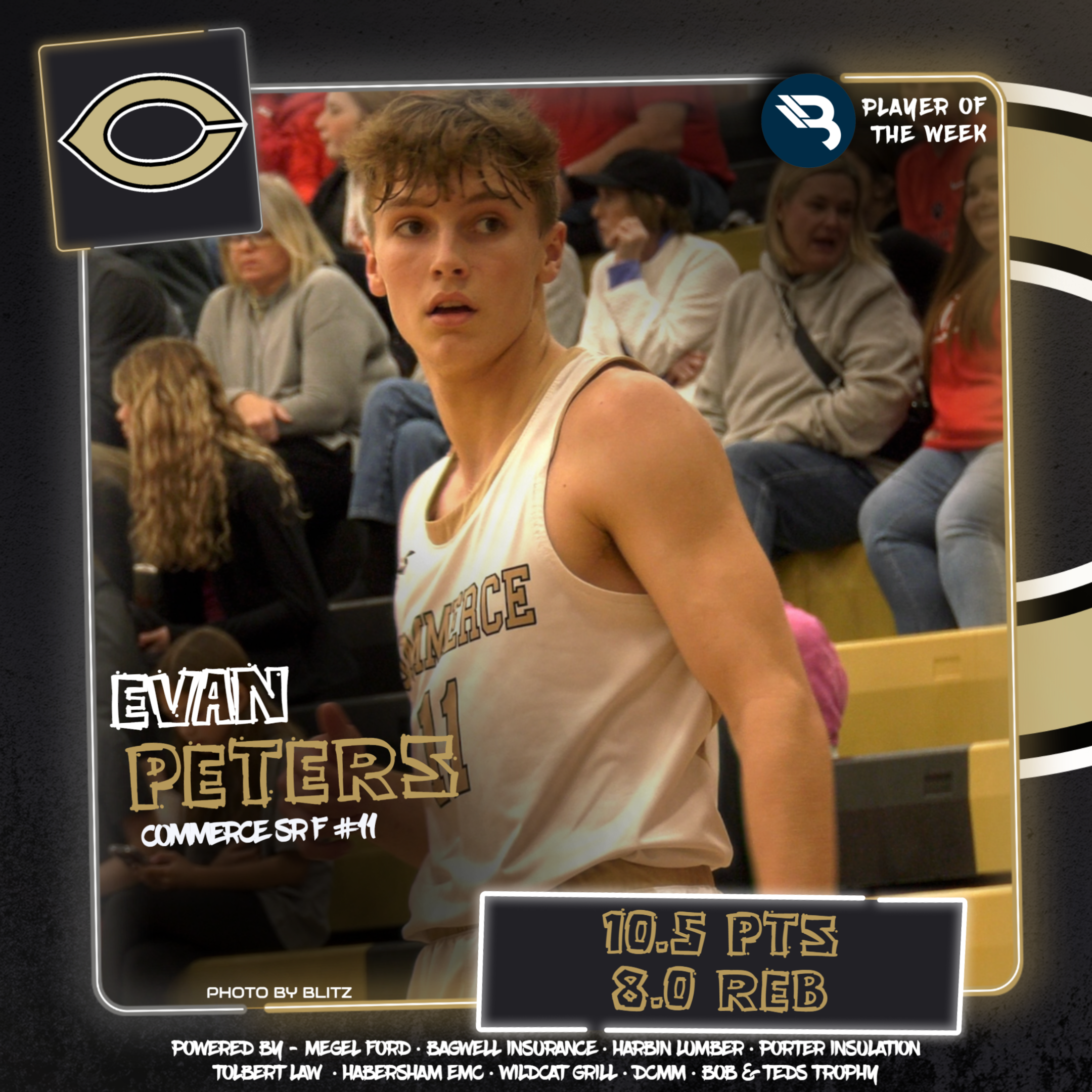 Back-to-back weeks for Evan Peters. The Commerce Tigers’ senior forward this time averaged 10.5 points and 8.0 rebounds in earning his second career POW award.