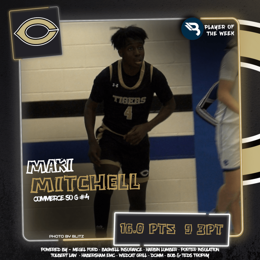 The BLITZ Boys Basketball Players of the Week are Neyo Bain (Tallulah Falls) and Maki Mitchell (Commerce). Bain won the Fan Vote with 7,477 of the 13,759 total votes. Mitchell was the BLITZ Pick.
